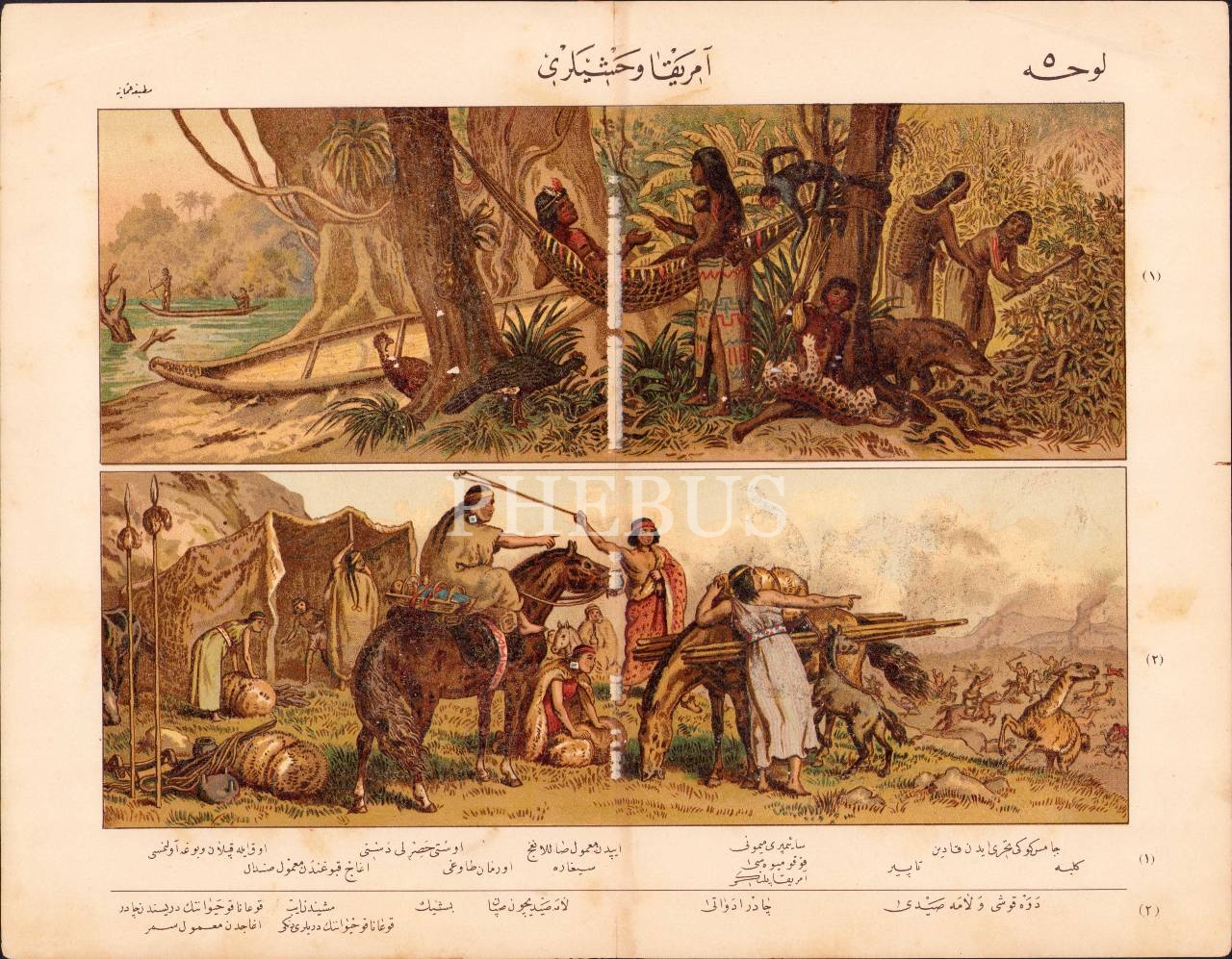 Osmanlıca "Amerika Vahşileri" taş baskı levha, Osmaniye Matbaası, 29x37 cm, tamirli haliyle