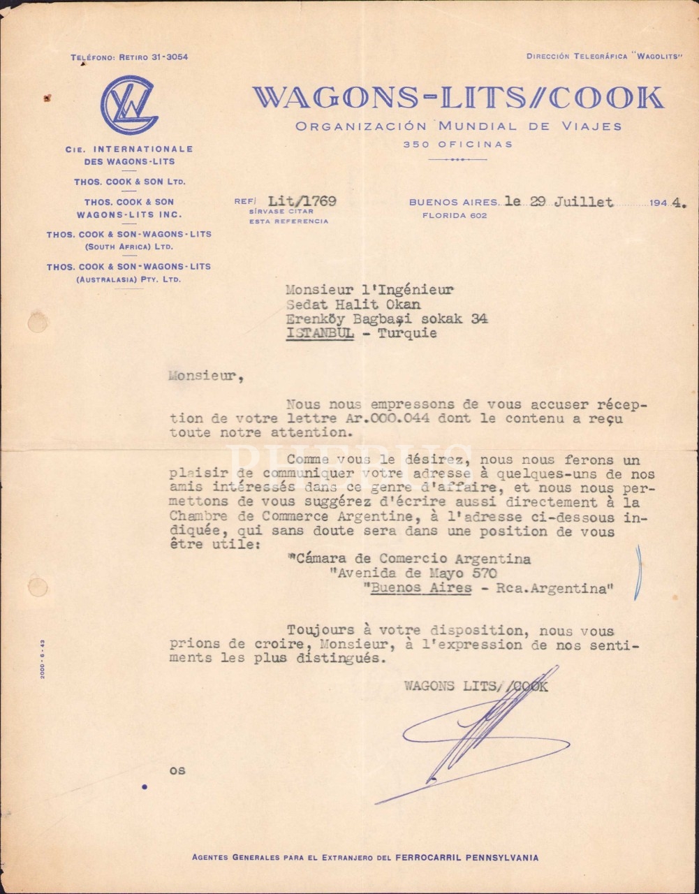 Orient Express'in işletmecisi Wagons-Lits/Cook antetli Fransızca evrak, 1944 tarihli, 21x27 cm