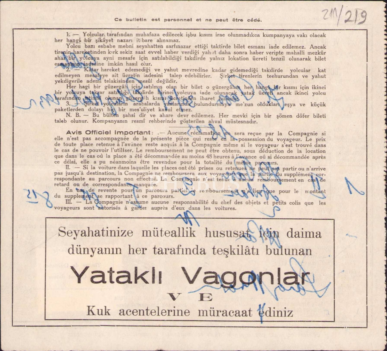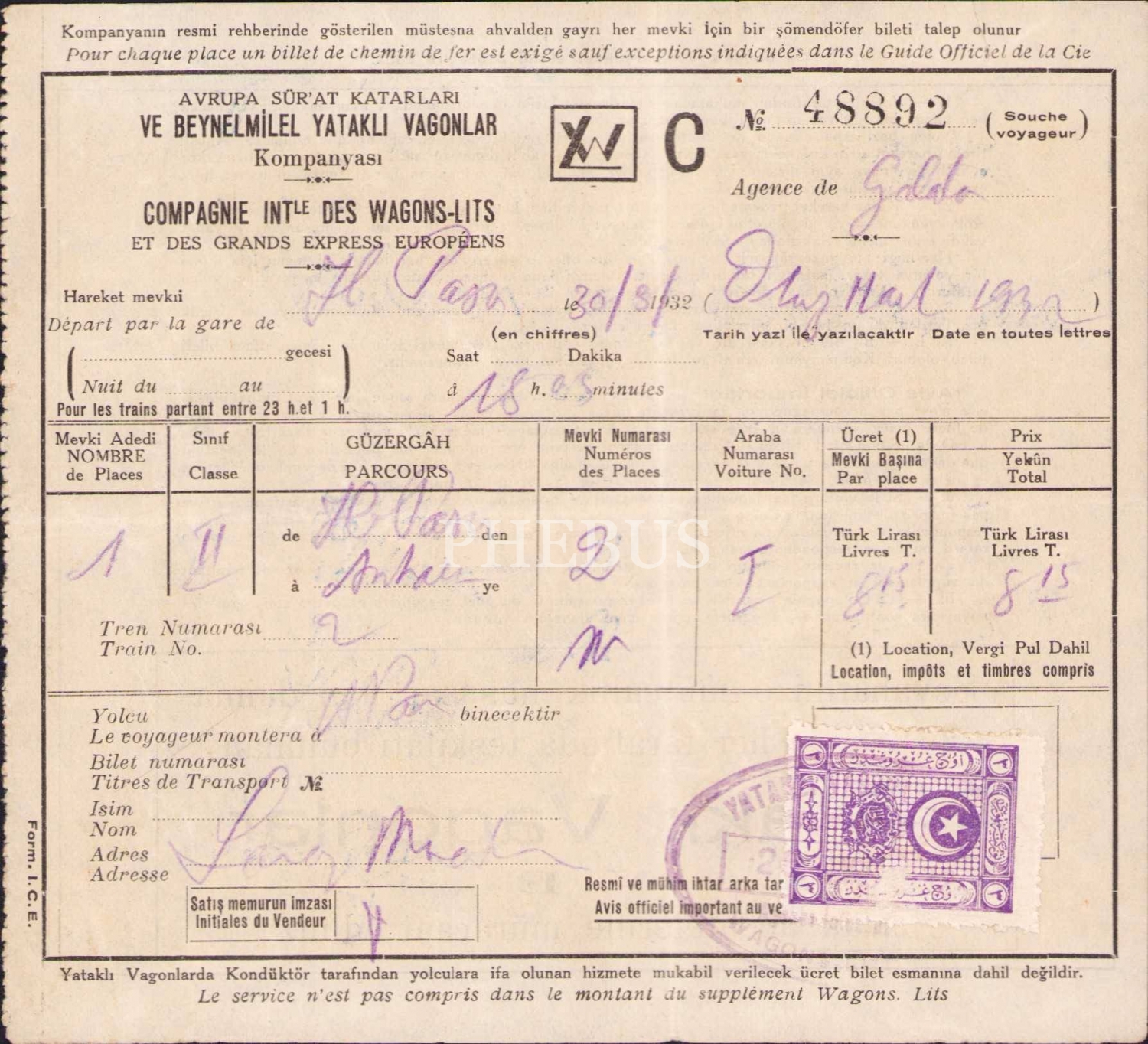 Orient Express'in işletmecisi Wagons- Lits, Avrupa Sür'at Katarları ve Beynelmilel Yataklı Vagonlar Kompanyası bileti, 1932 tarihli, 14x15 cm