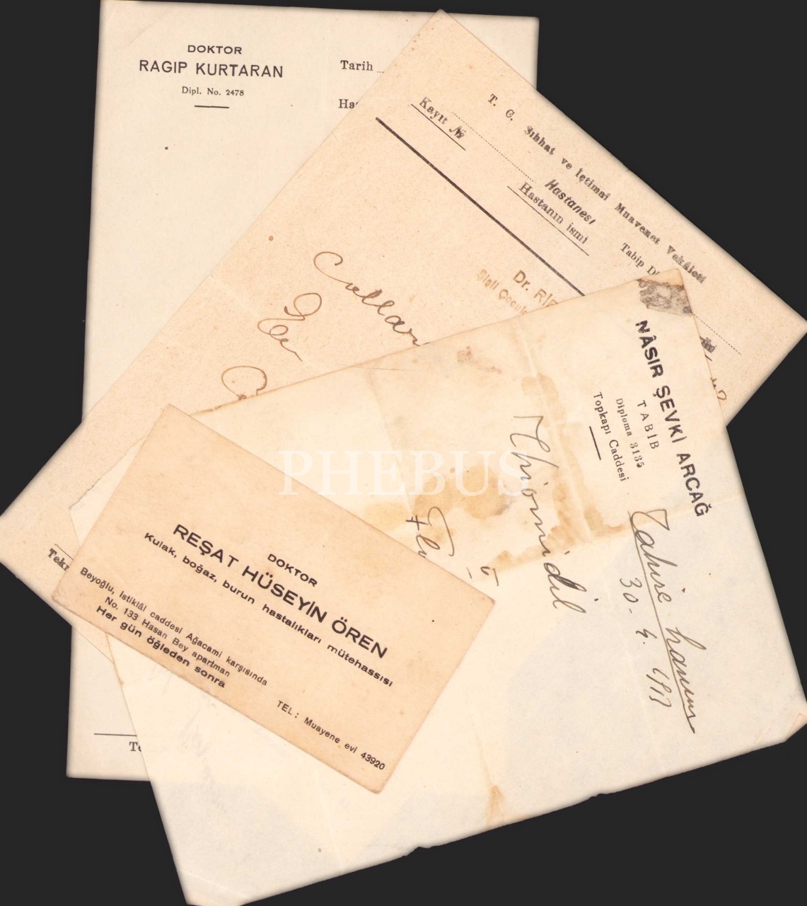 Doktor isimleri antetli reçete kâğıtları ve doktor kartviziti, 1913 ve 1942 tarihli, çeşitli boyutlarda (ortalama: 12x16 cm)