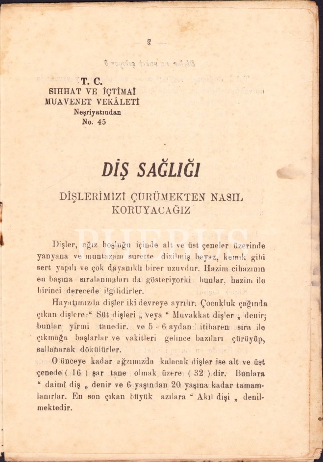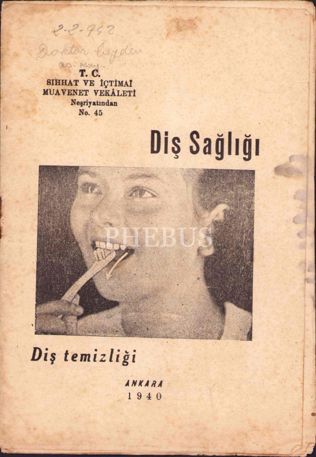 Diş Sağlığı rehberi, T.C. Sıhhat ve İçtimaî Muavenet Vekâleti yayınlarından, Ankara 1940, 11 s., 14x21 cm, yorgun haliyle