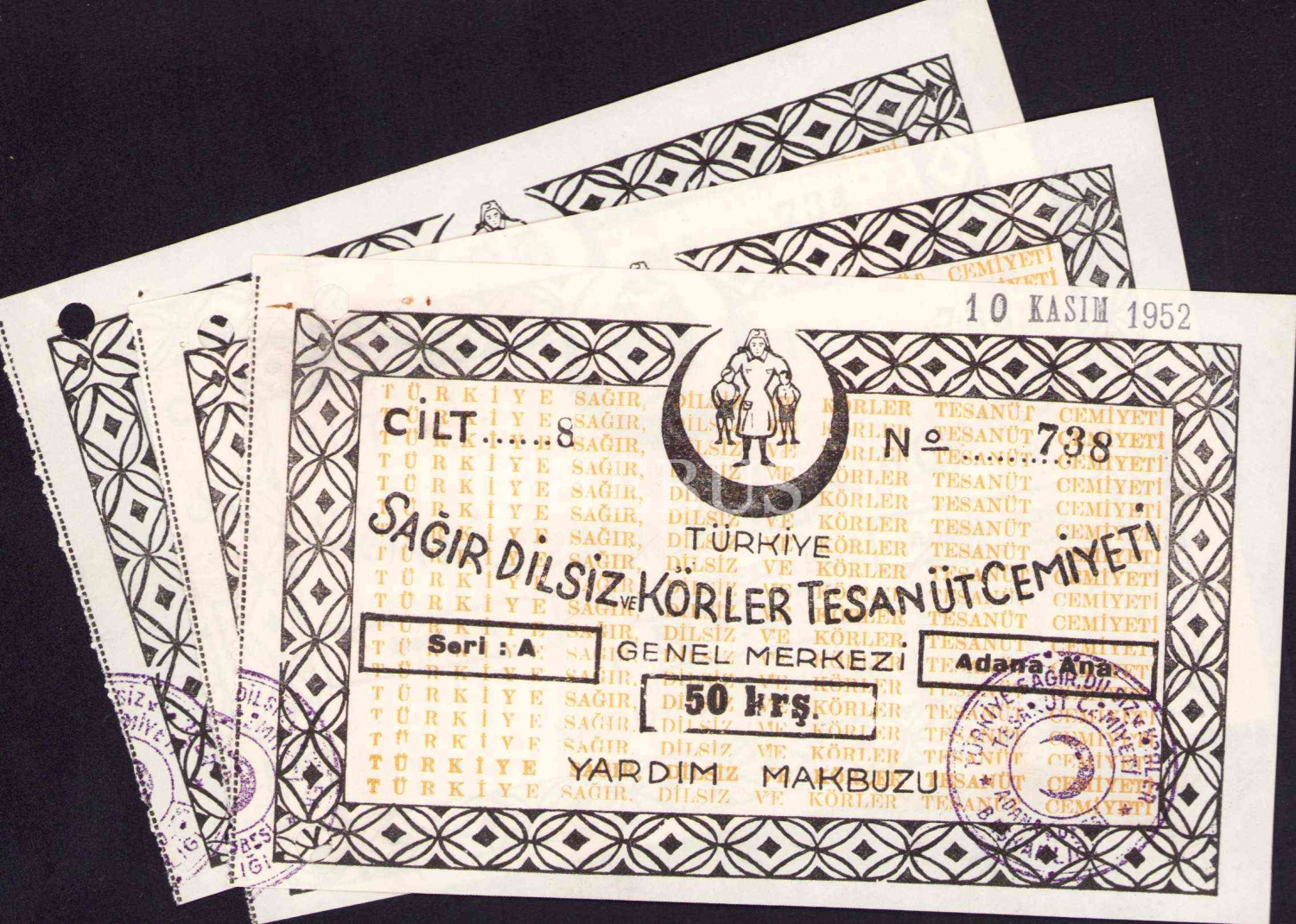 Sağır Dilsiz ve Körler Tesanüt [Dayanışma] Cemiyeti'ne ait 3 adet yardım makbuzu, 1952 tarihli, 9x15 cm