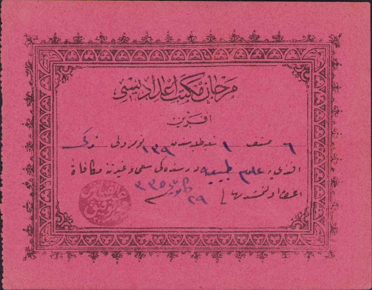 Osmanlı Aferin, Mercan Mektebi İdadisi Zeki Efendi, 1325 tarihli, 11x8cm