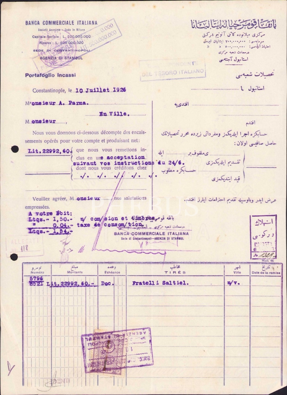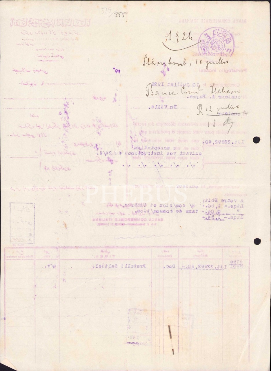 Osmanlıca-İtalyanca Banca Commerciale İtaliana antetli makbuz, 1926 tarihli, 21x29 cm