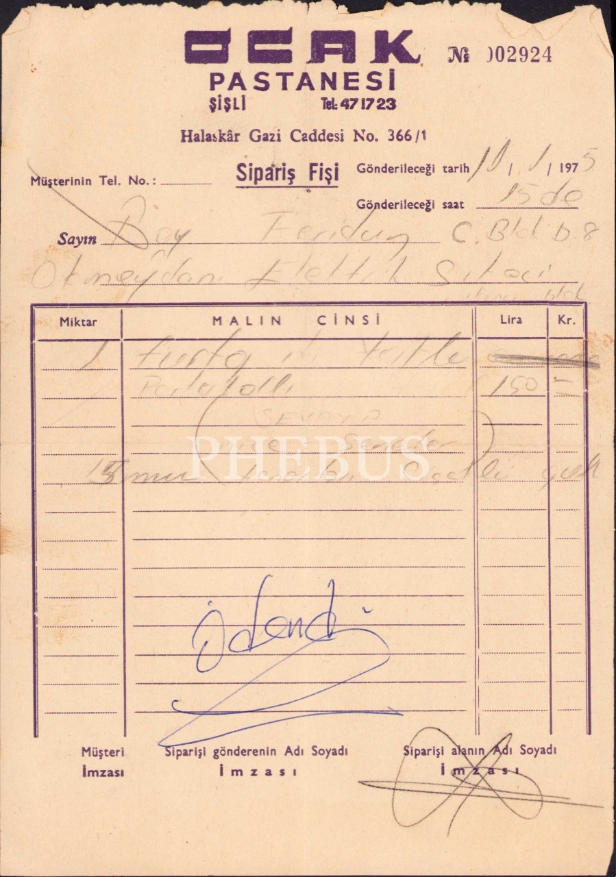 Ocak Pastanesi-Şişli antetli fatura, 1975 tarihli, 16x23 cm