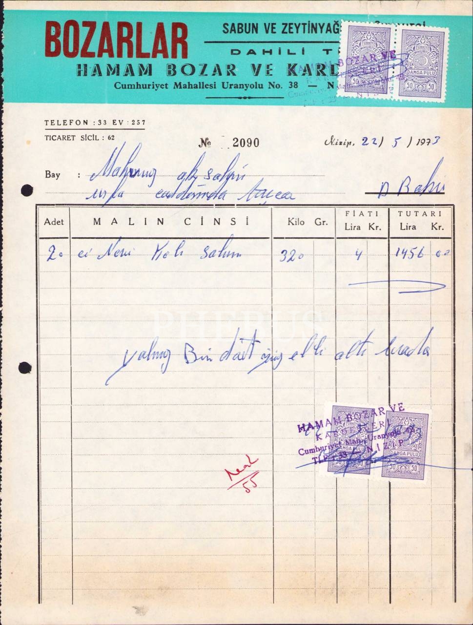 Bozarlar Sabun ve Zeytinyağı İmalâthanesi antetli fatura, 1973 tarihli, 21x28 cm