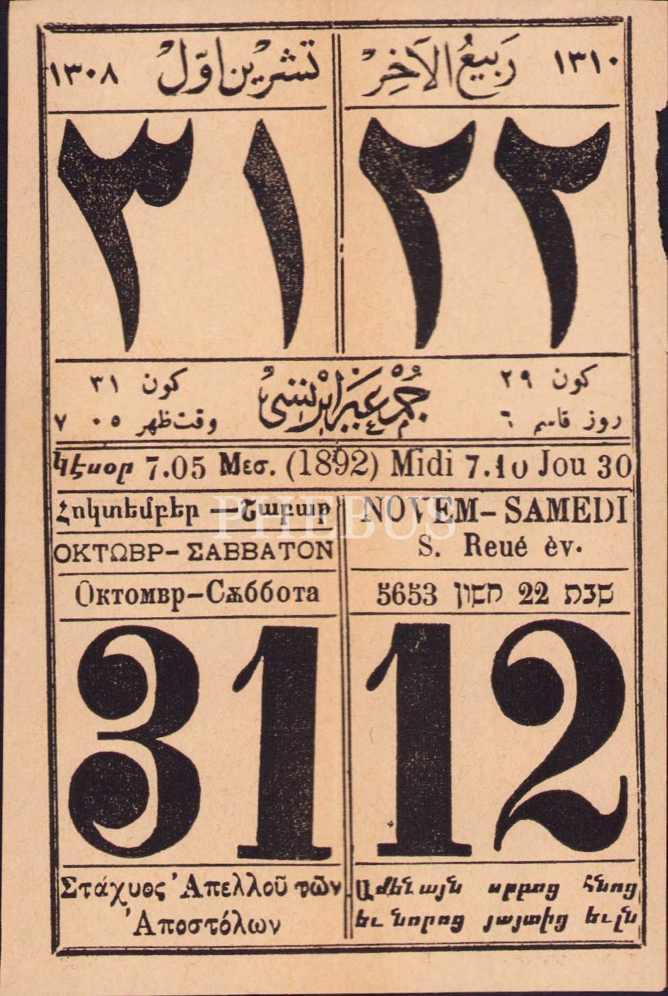 1892 senesine ait Osmanlıca-Rusça-İbranice-Rumca-Ermenice vd. dillerde takvim yaprağı, 8x12 cm