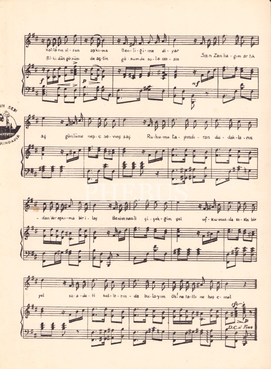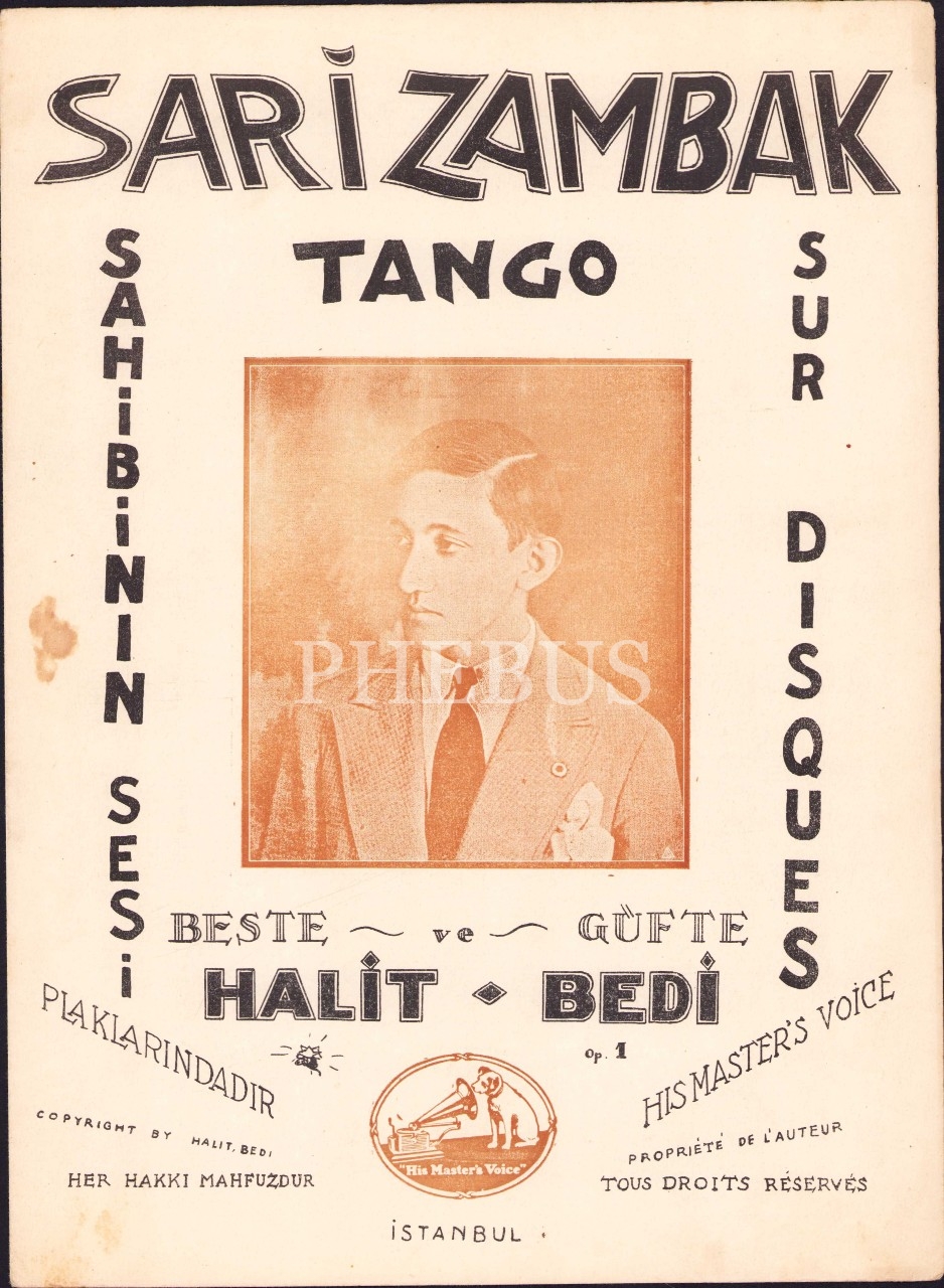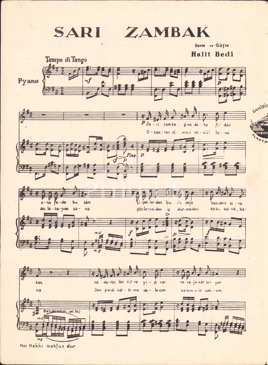 Beste ve güftesi Halit Bedi'ye ait Sarı Zambak tango notası, Sahibinin Sesi Plakları, İstanbul, 25x34 cm