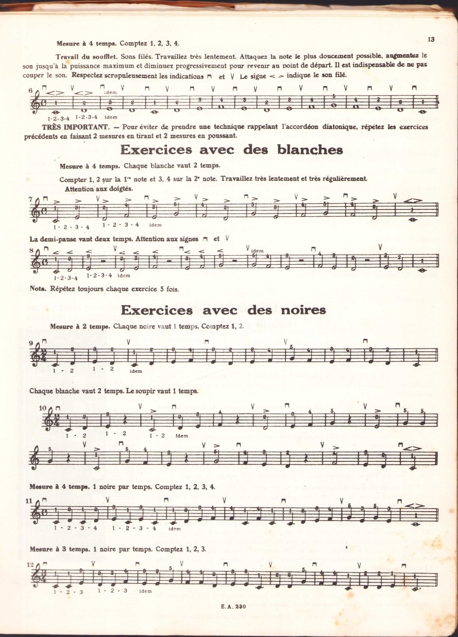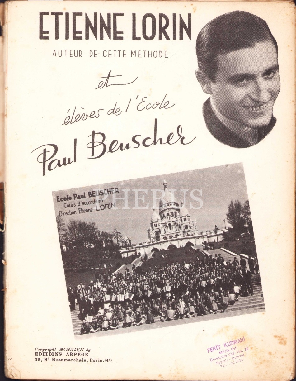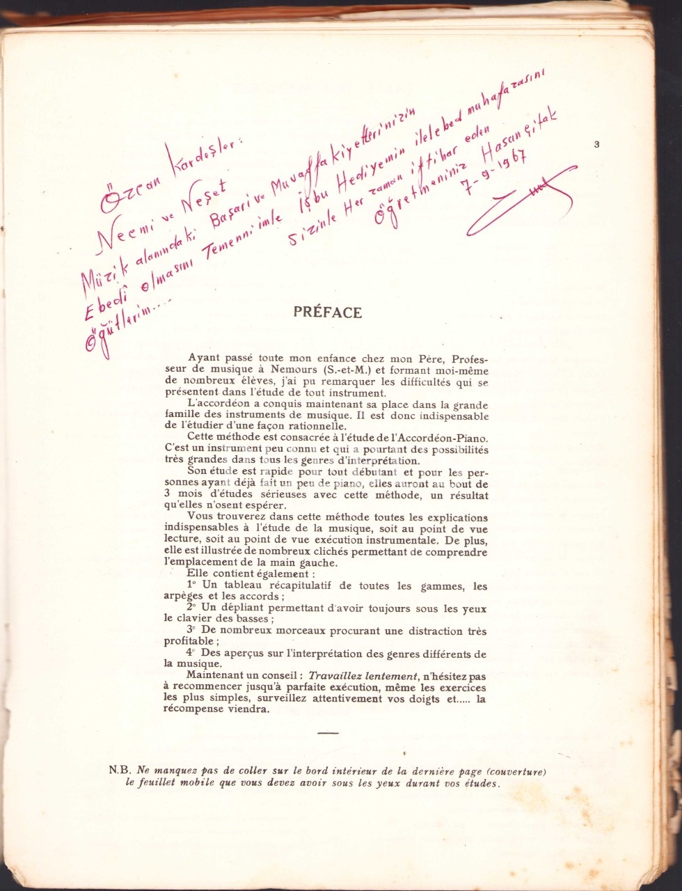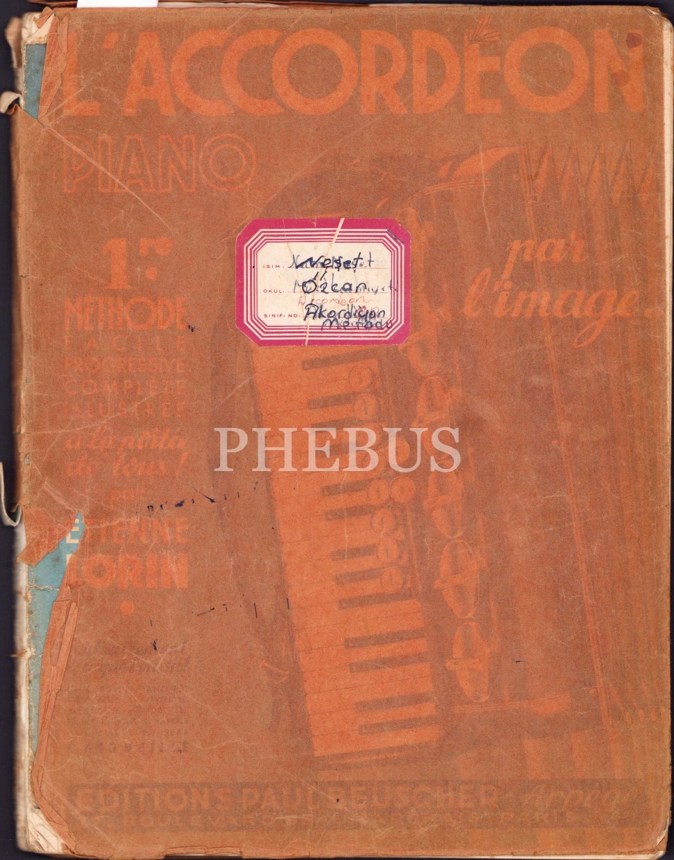 Fransızca L'Accordeon nota metod defteri, 99 s., öğretmenden öğrencilerine ithaflı ve imzalı, 24x31 cm, kapağı epey yıpranmış haliyle