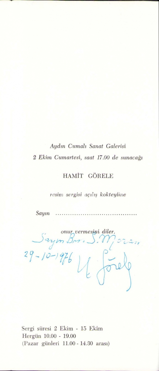 Cumhuriyetin İlk Kuşak Ressamlarından Hamit Görele'den İthaflı ve İmzalı Resim Sergisi Davetiyesi, Aydın Cumalı Sanat Galerisi, 2-15 Ekim 1976, 9x22 cm
