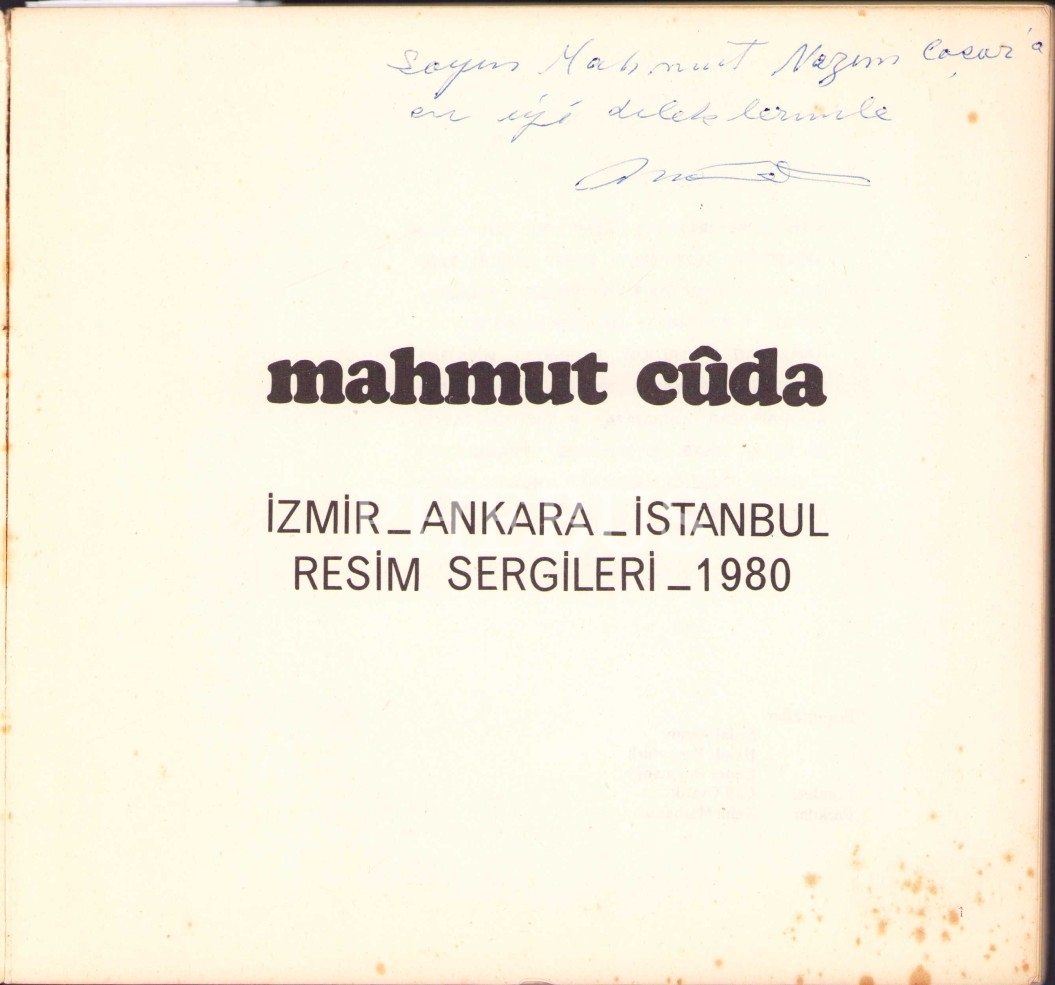 Ressam Mahmut Cûda'dan İthaflı ve İmzalı "Mahmut Cûda İzmir-Ankara-İstanbul Resim Sergileri-1980-, 132 sayfa, 23x21 cm
