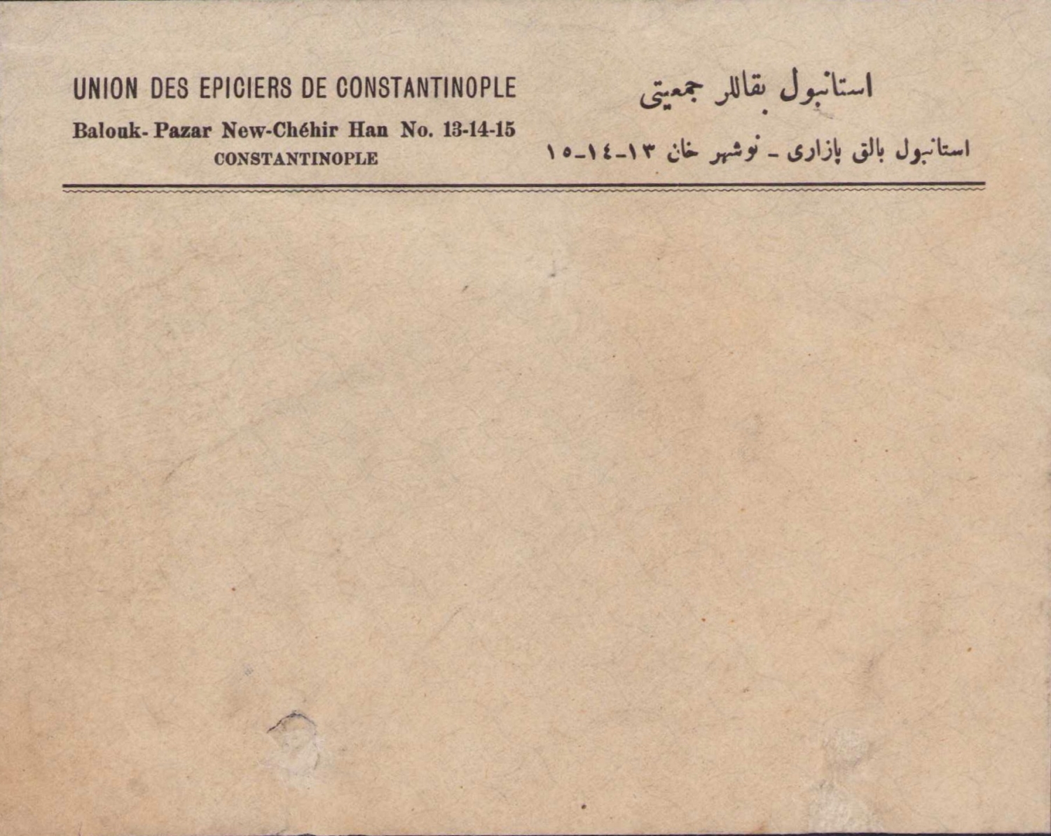 Osmanlı İstanbul Bakkallar Cemiyeti antetli zarf, Osmanlıca - Fransızca