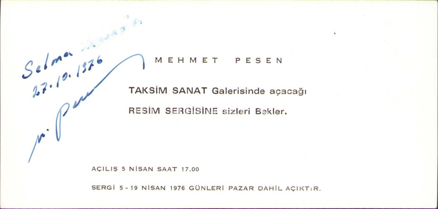 Bedri Rahmi Eyüboğlu'nun Talebelerinden Ressam Mehmet Pesen'den İthaflı ve İmzalı Resim Sergisi Davetiyesi, 5 Nşsan 1976, Taksim Sanat Galerisi, 18x9 cm