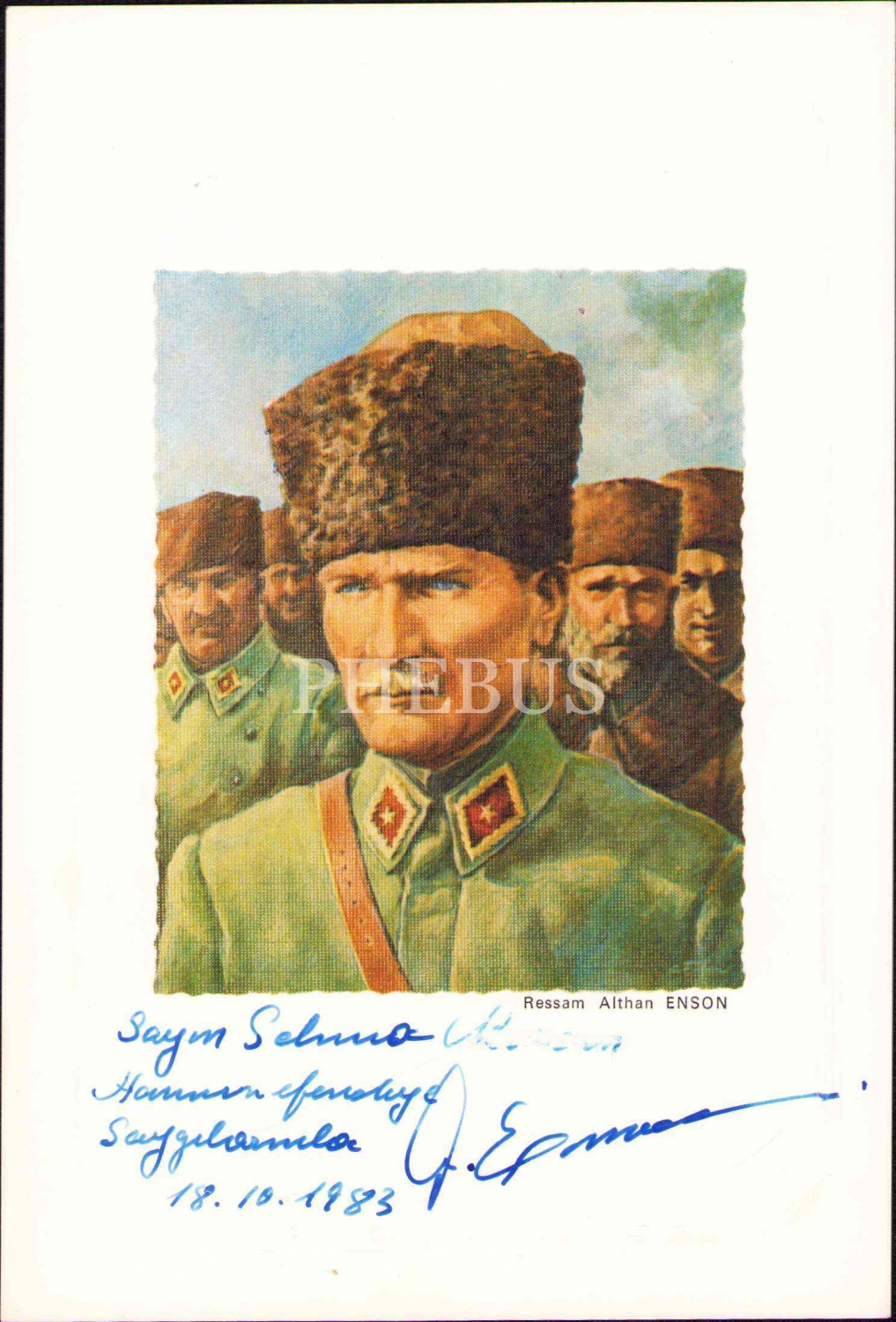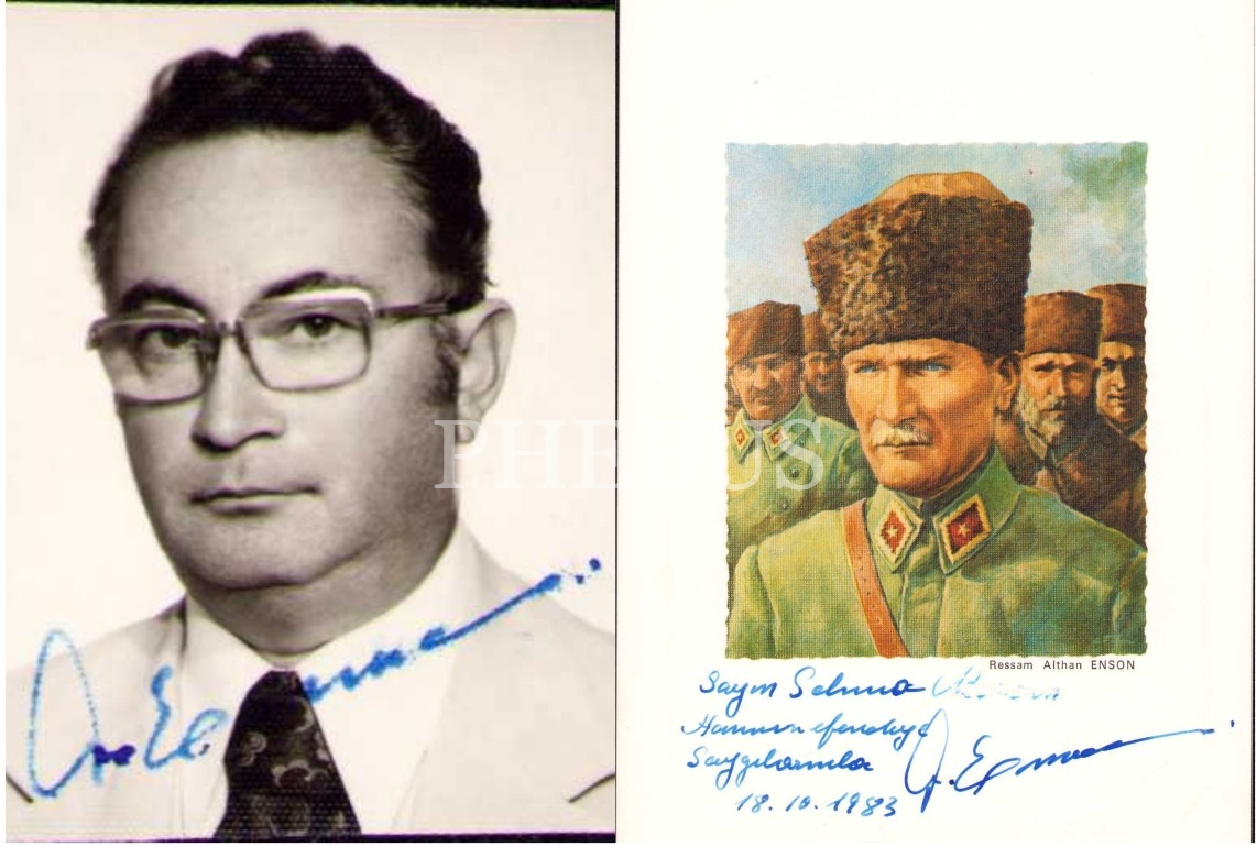Mustafa Kemal Atatürk Portreleri Ressamı Olarak Bilinen Althan Enson'un İmzalı Vesikalık Fotoğrafı ile İthaflı ve İmzalı Baskı Mustafa Kemal Atatürk Resmi, kart 8x10 cm fotoğraf 4x4 cm