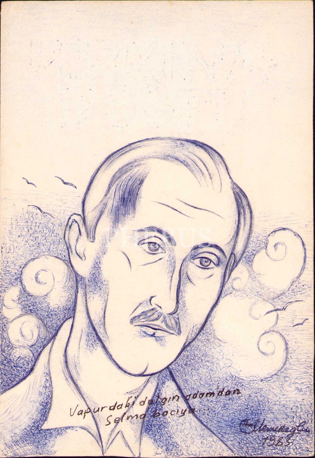 Ressam Avni Memedoğlu'ndan İthaflı ve İmzalı Tükenmez Kalem: Vapurdaki Dalgın Adam, 1983, 17x25 cm