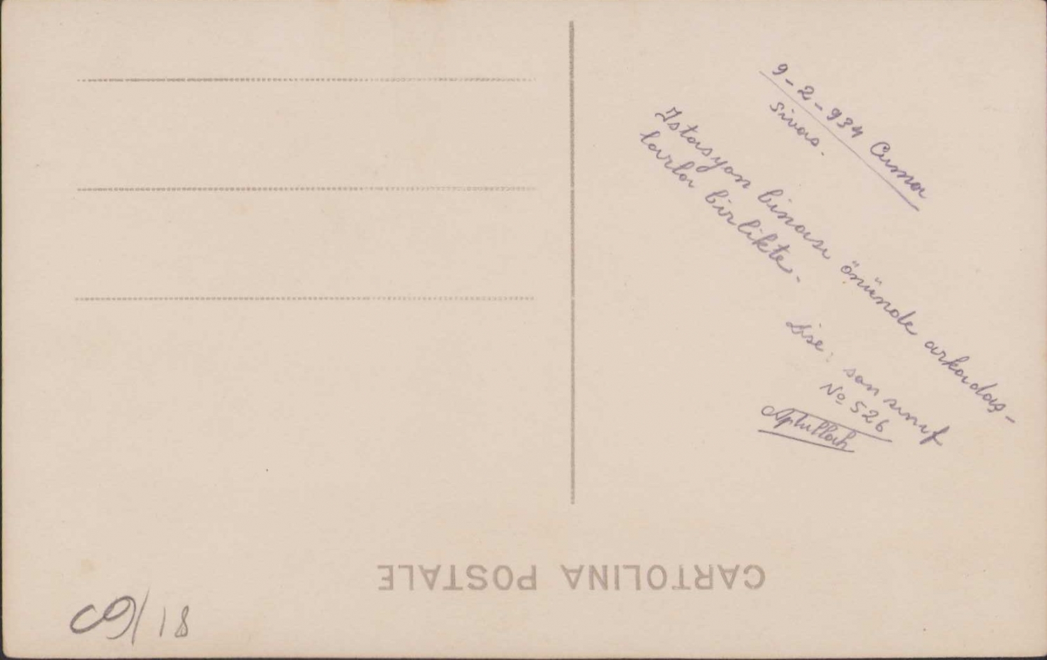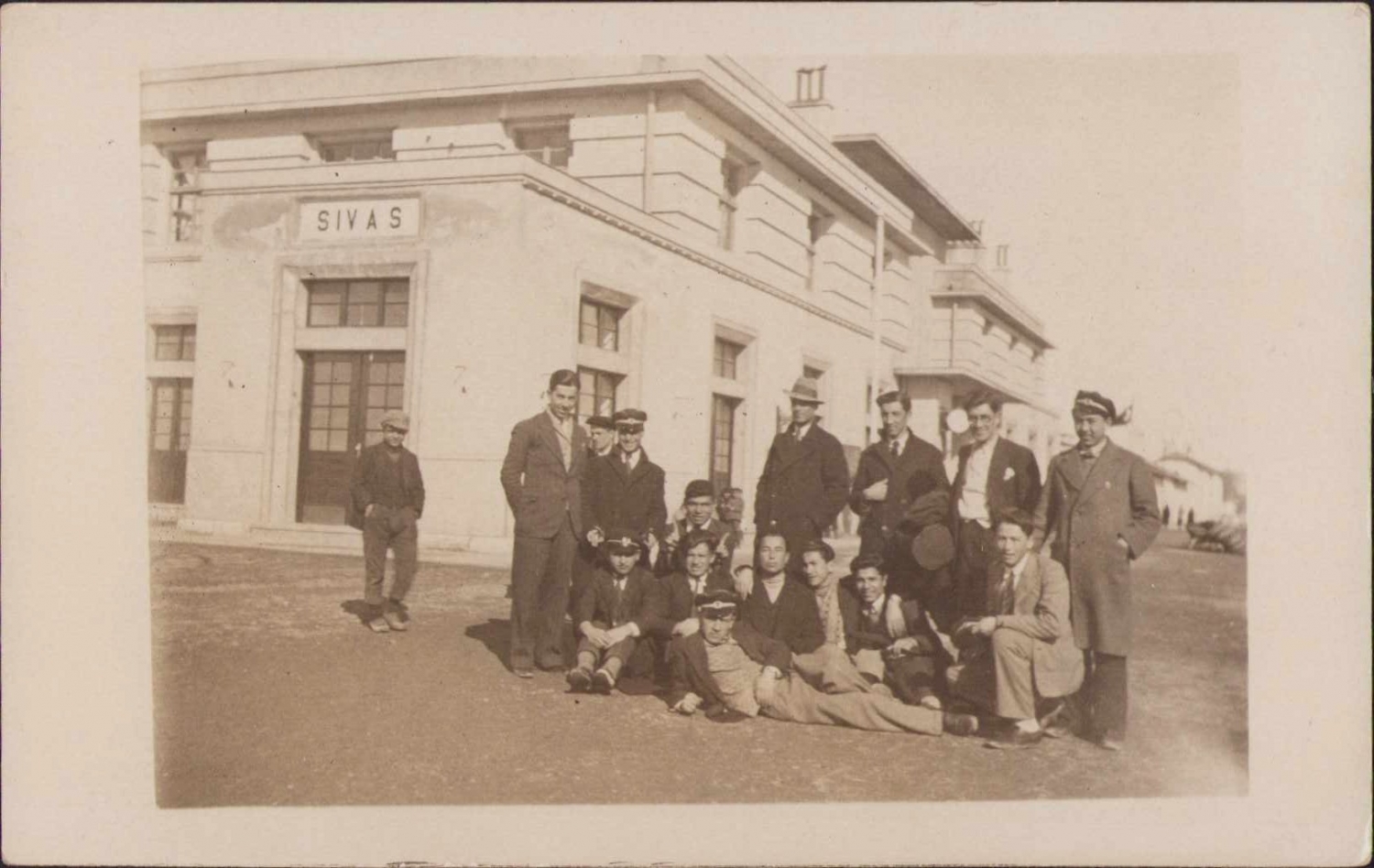 Sivas Tren İstasyonu önünde çekilmiş hatıra fotoğrafı, 1934 tarihli, 14x9cm