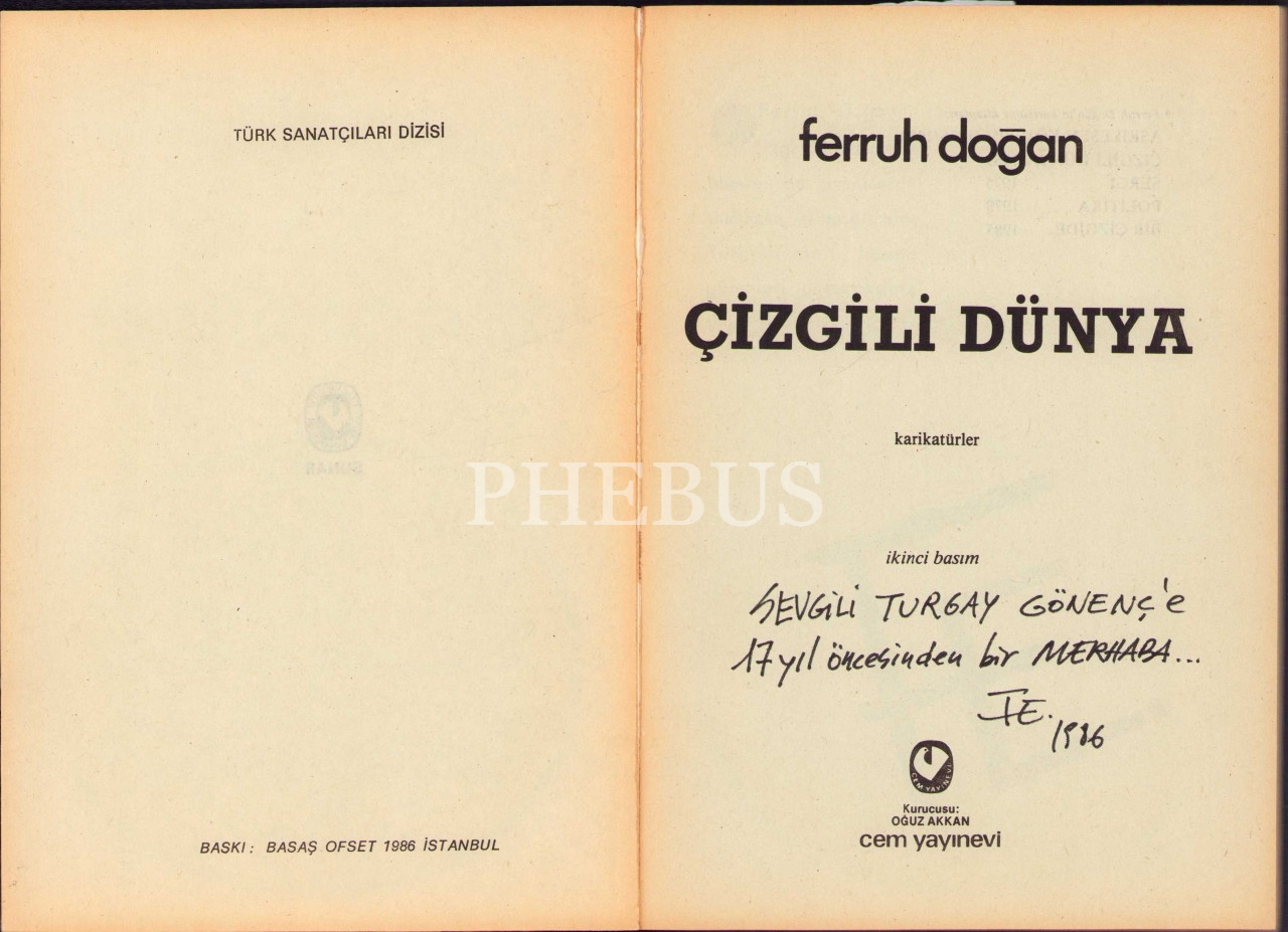 Karikatürist Ferruh Doğan'dan Şâir ve Ressam Turgay Gönenç'e İthaflı "Çizgili Dünya", Cem Yayınevi, İstanbul, 1986, 131 sayfa, 13x20 cm