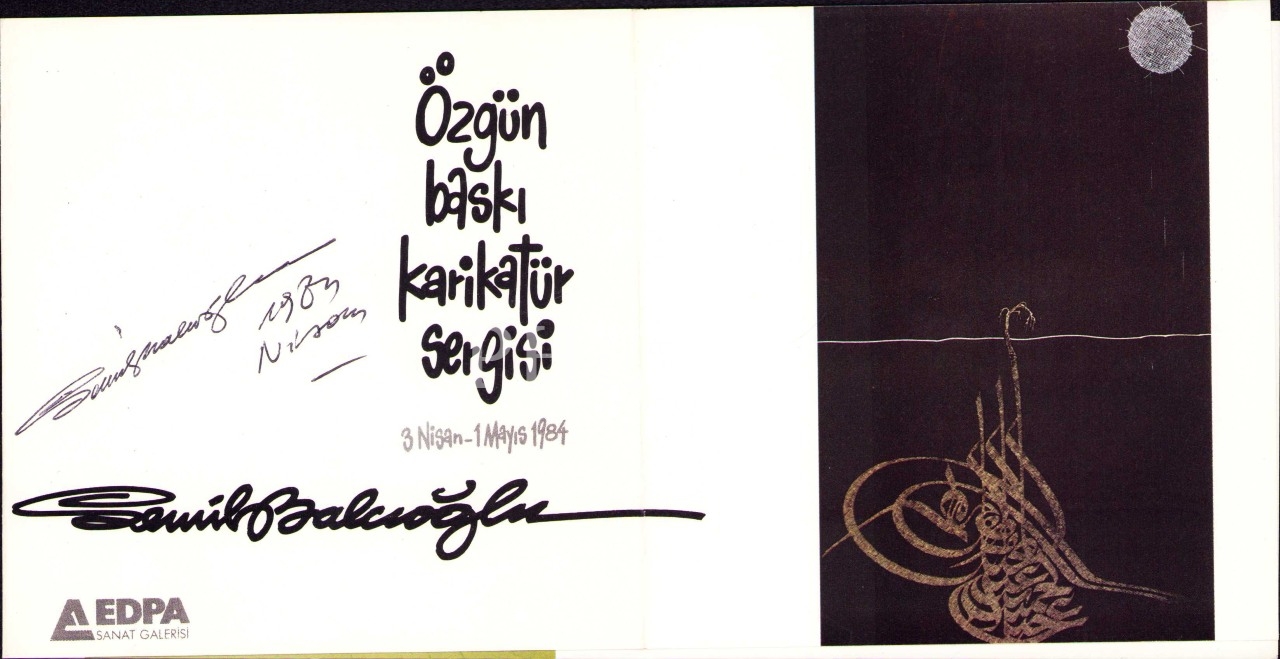 Karikatürist Semih Balcıoğlu'ndan İthaflı ve İmzalı "Özgün Baskı Karikatür Sergisi", 3 Nisan-1 Mayıs 1984, EDPA Sanat Galerisi, 4 sayfa, 28x15 cm