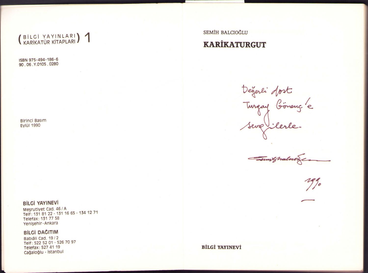 Karikatürist Semih Balcıoğlu'ndan Şair ve Yazar Turgay Gönenç'e İthaflı ve İmzalı "Karikaturgut", Bilgi Yayınevi, Birinci Baskı, Eylül 1990, 253 sayfa, 14x20 cm
