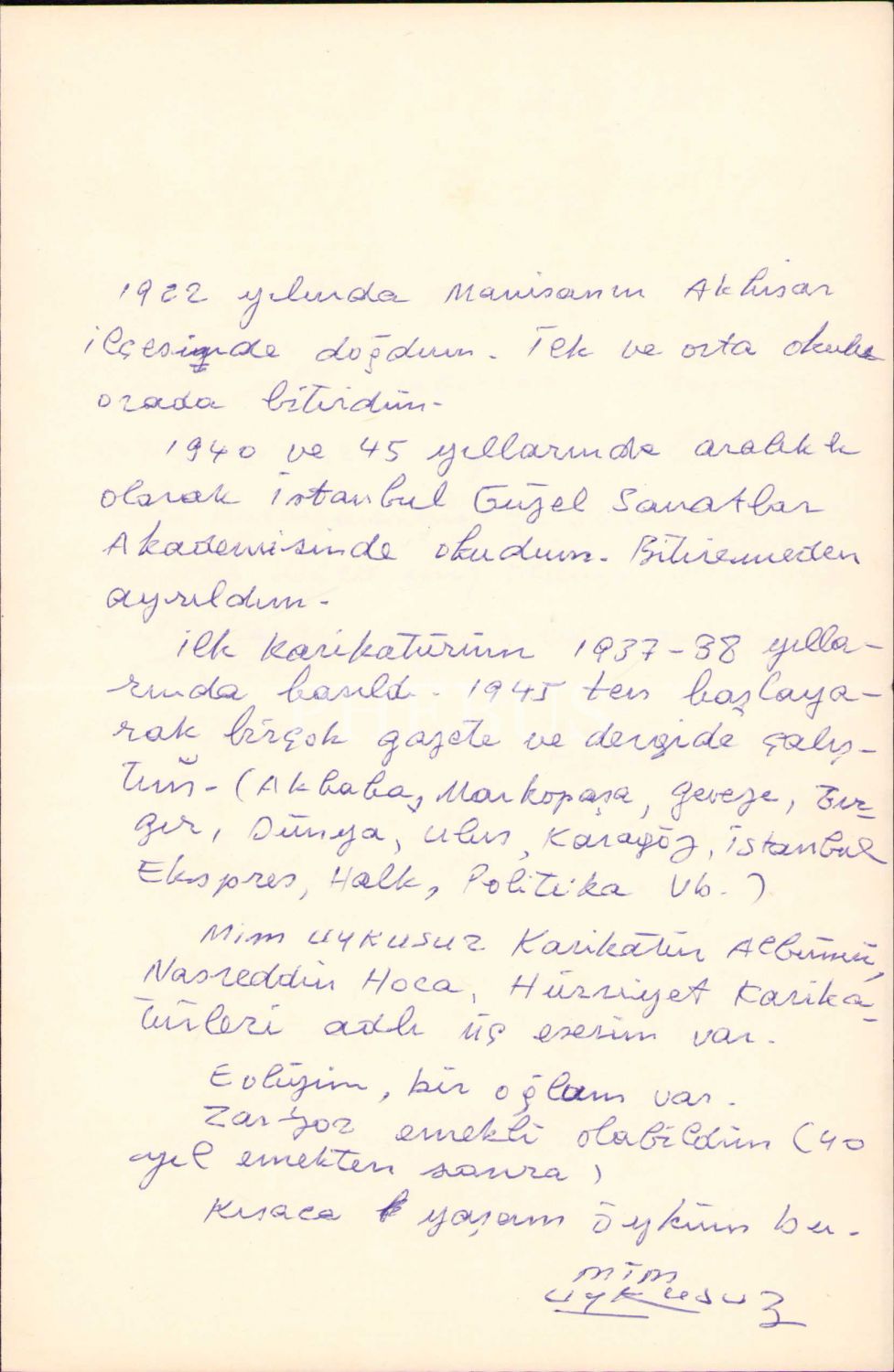 Marko Paşa Dergisinin Baş Karikatüristi Mim [Mustafa] Uykusuz'un El Yazısıyla Otobiyografisi [CV'si], 14x21 cm