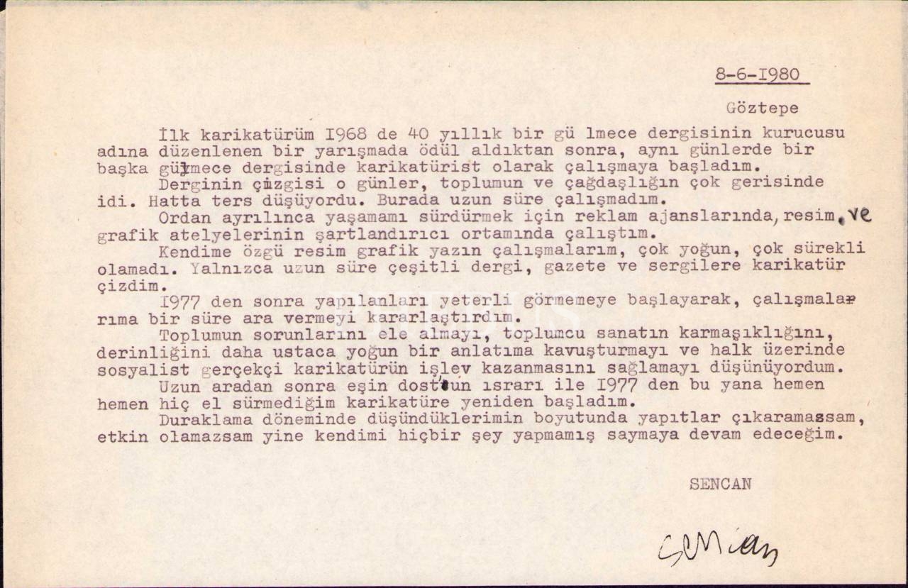Karikatürist Şencan Güngör'ün İmzalı Otobiyografisi [CV'si], 1980 târihli, 22x14 cm