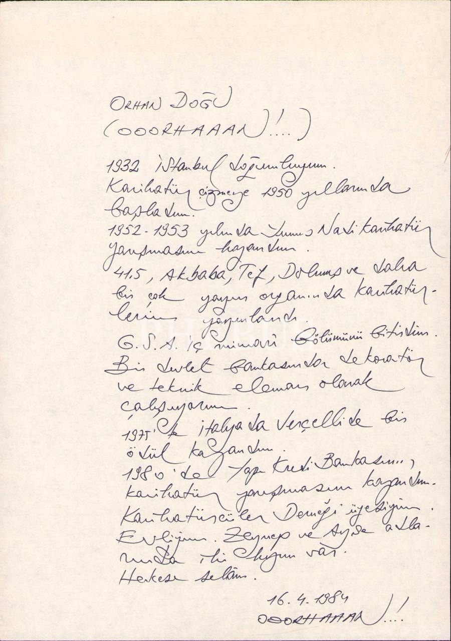 Karikatürist Orhan Doğu'nun El Yazısıyla CV Mahiyetindeki Otobiyografisi, 1984 tarihli, 21x30 cm