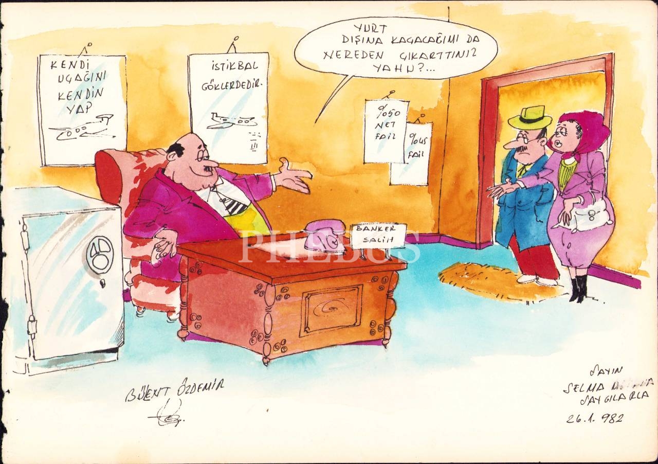 Karikatürist Bülent Özdemir'den İthaflı ve İmzalı Orijinal Çizim Renkli Karikatür, 1982 tairhli, 34x24 cm