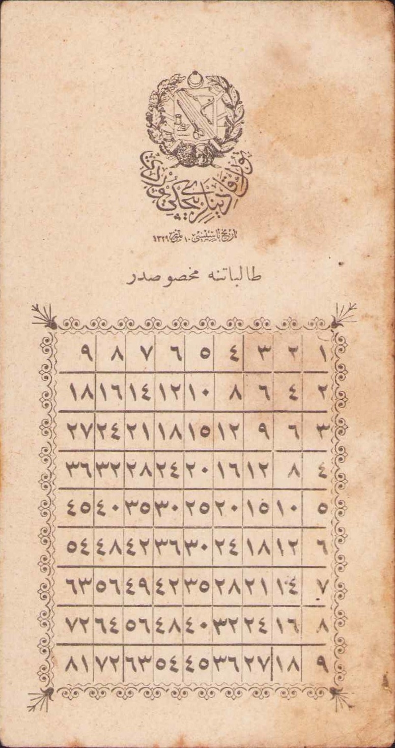 Osmanlı Türk Kadınları Biçki Yurdu talebelerine mahsus çarpım tablosu, 6x12cm