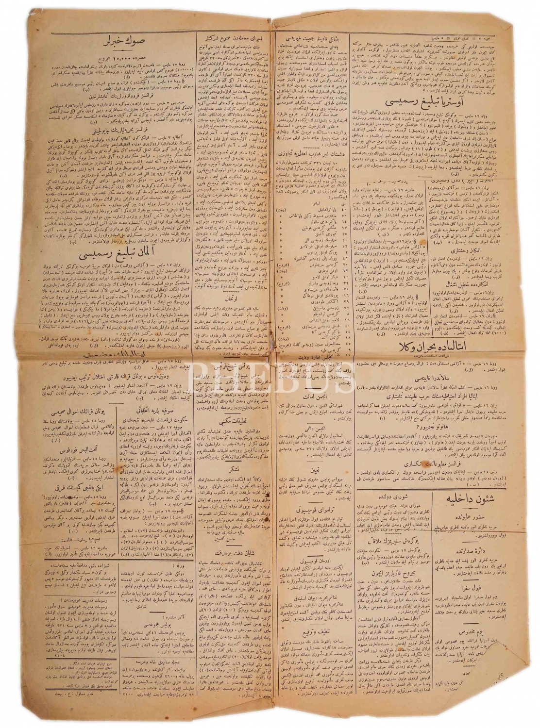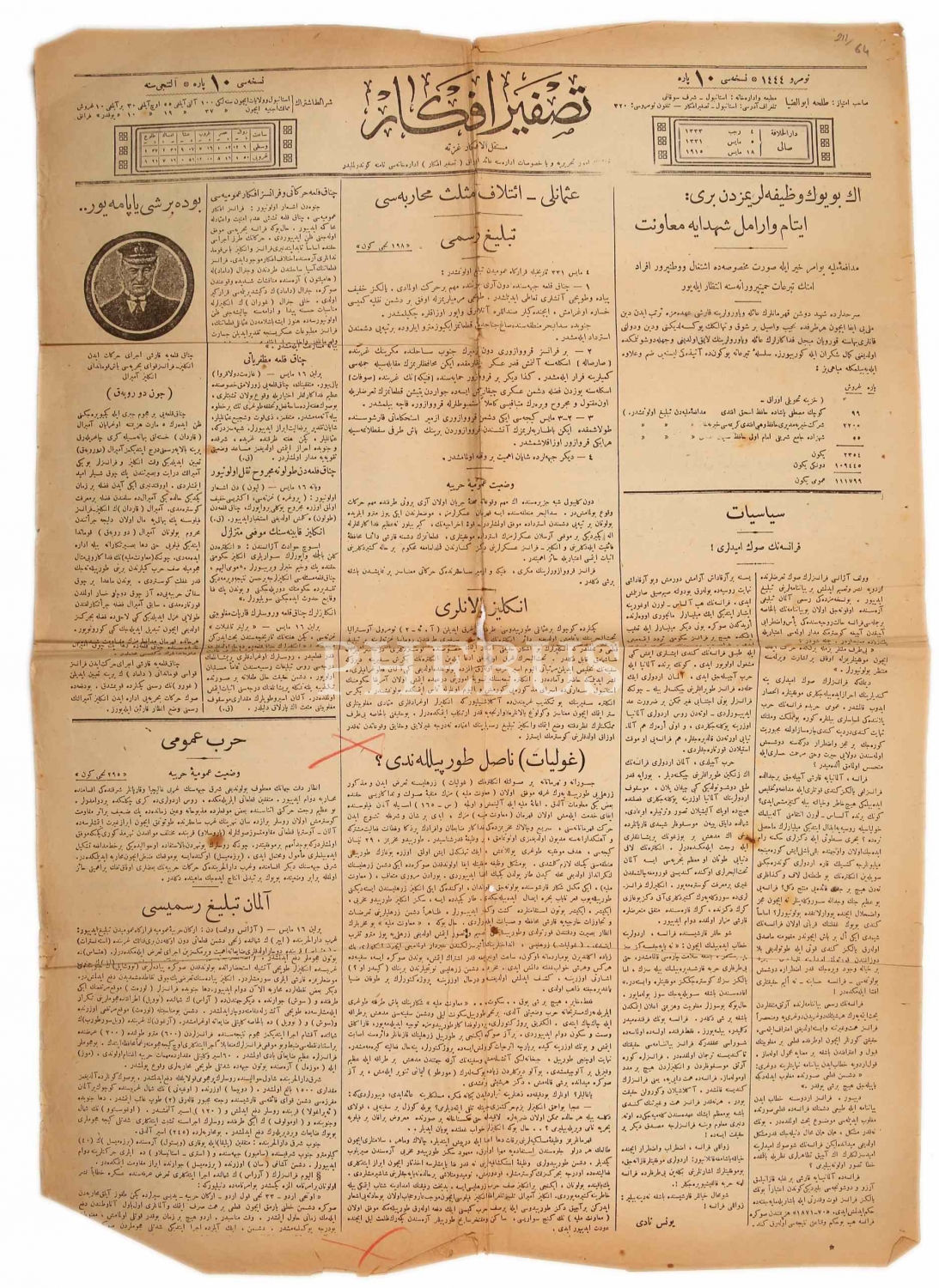 Osmanlıca Tasfîr-i Efkâr gazetesi, 18 Mayıs 1915, tek yaprak, 43x62 cm, yıpranmış haliyle