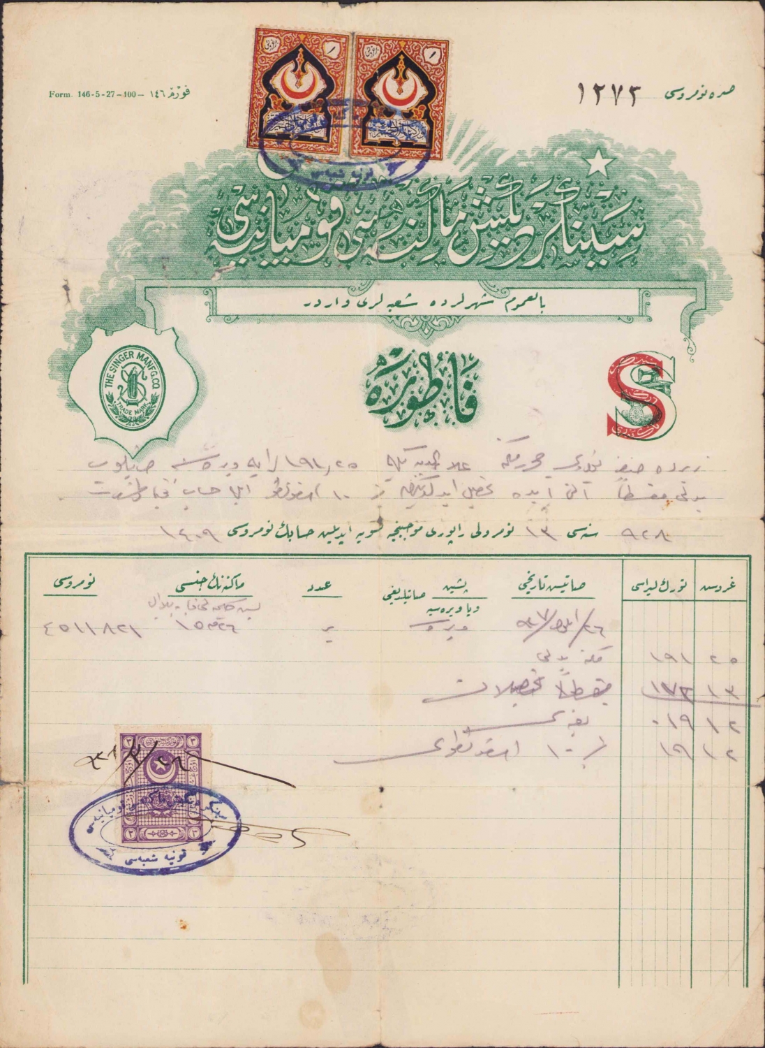 Osmanlıca Singer Dikiş Makinesi antetli fatura, 1927 tarihli, Hilal-i ahmer pullu, damgalı, 20x28cm