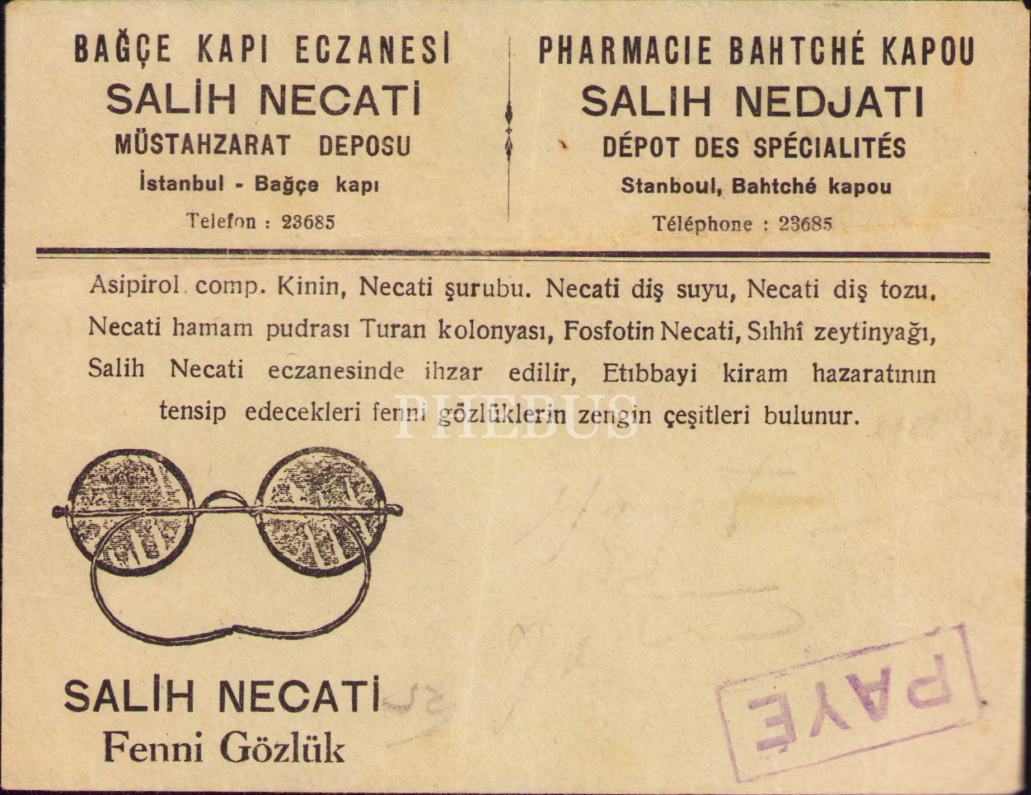 Türkçe-Fransızca Bağçe Kapı Eczanesi antetli zarf, 11x14 cm, yorgun haliyle