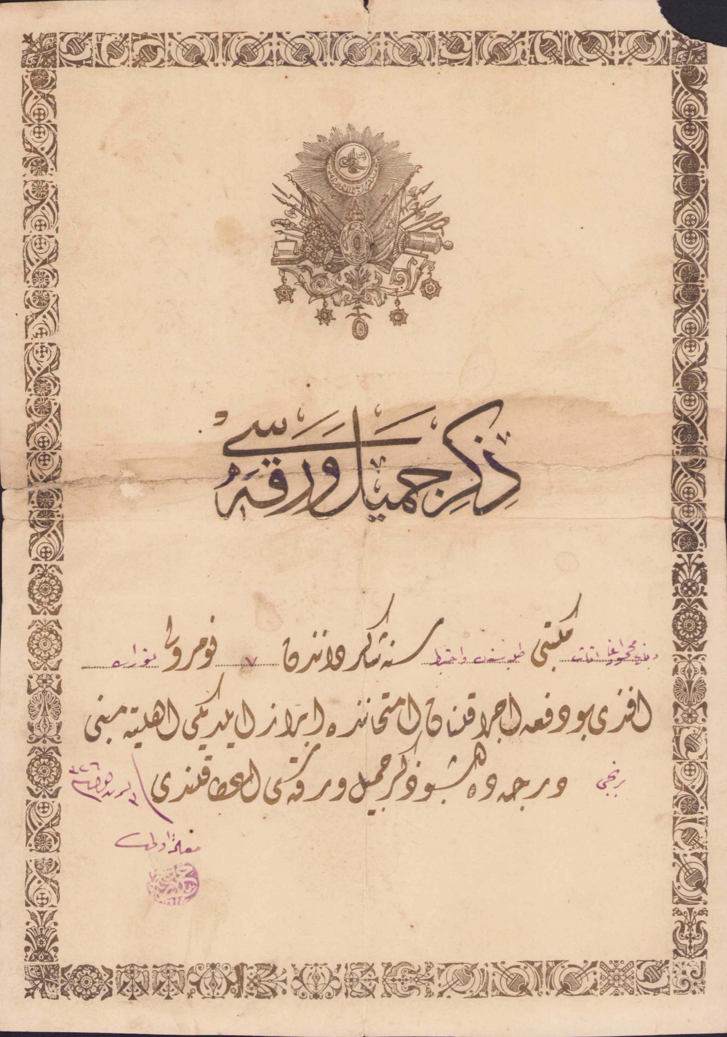 Osmanlı Debbağ Mahmud Ağa İnas Mektebi Zikri Cemil Varakası, 1326 tarihli, ortadan tamirli, mühürlü,