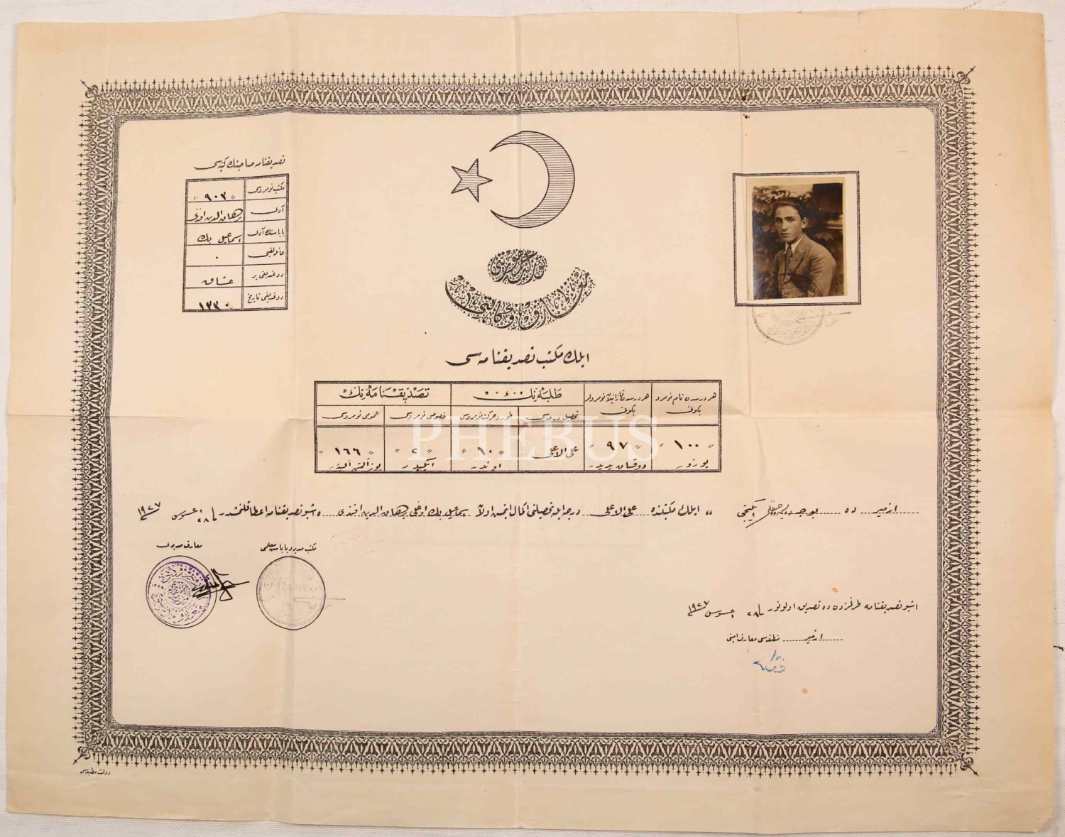 Osmanlıca fotoğraflı ilkokul tasdiknamesi, İzmir 1927, 35x45 cm