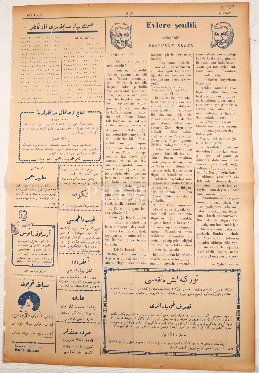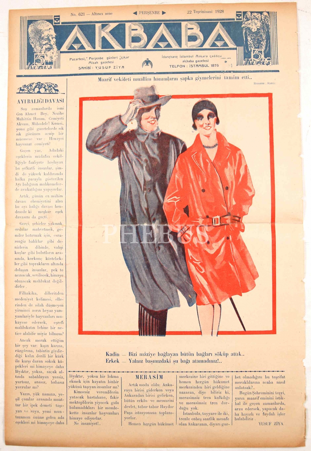 Ön kapak resmi: "Kadin: Bizi mâziye bağlayan bütün bağları söküp attık.. Erkek: Yalnız başınızdaki şu bağı atamadınız!.." *Akbaba, Türk edebiyatının en uzun ömürlü mizah dergilerindendir. Yusuf Ziya Ortaç ve Orhan Seyfi Orhon tarafından 1922 yılında yayın hayatına başlayan dergi, 1977 yılına kadar faaliyetini sürdürmüştür.