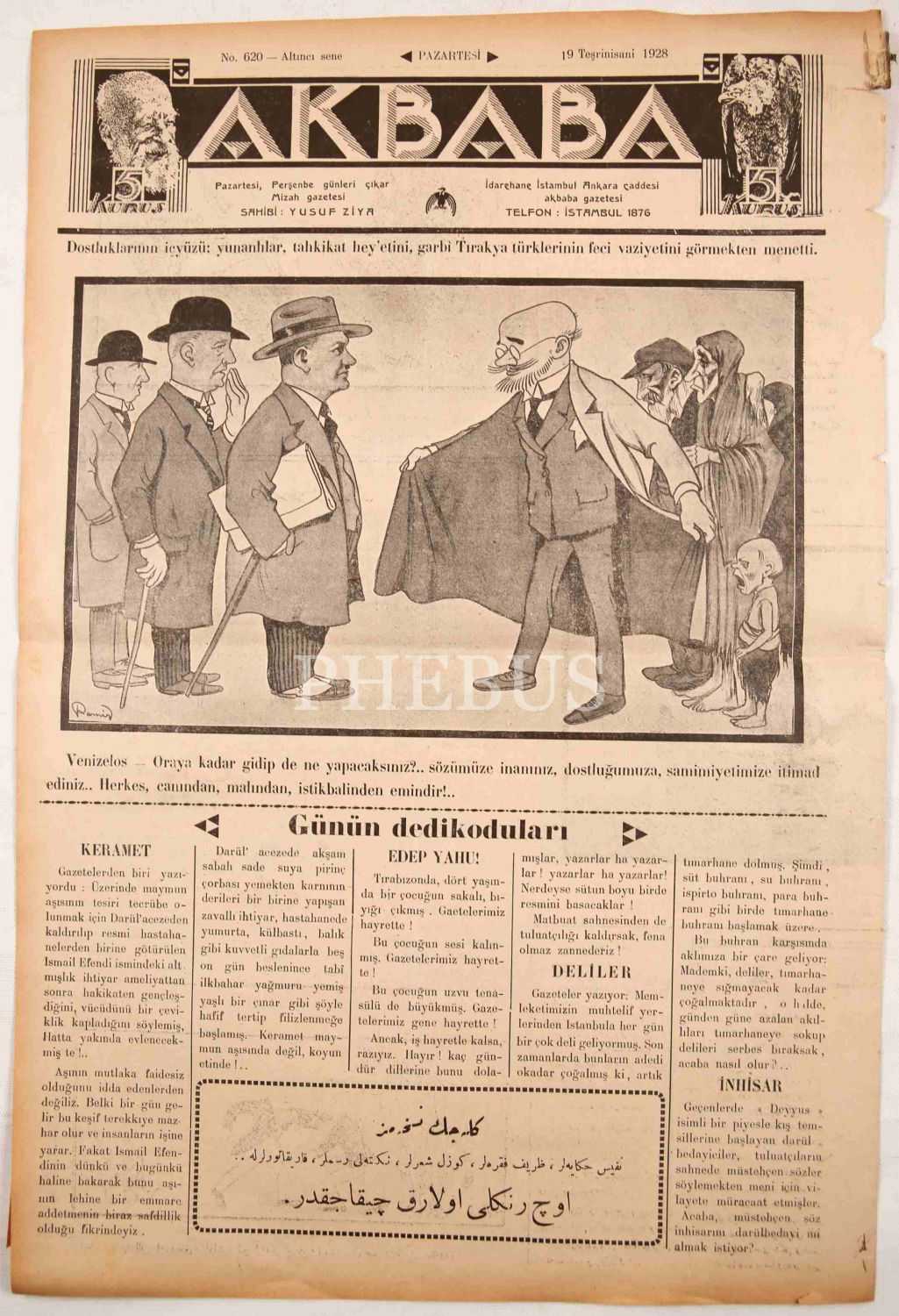 Ön kapak resmi: "Dostluklarının içyüzü: yunanlılar, tahkikat hey'etini, garbî Tırakya türklerinin feci vaziyetini görmekten menetti." *Akbaba, Türk edebiyatının en uzun ömürlü mizah dergilerindendir. Yusuf Ziya Ortaç ve Orhan Seyfi Orhon tarafından 1922 yılında yayın hayatına başlayan dergi, 1977 yılına kadar faaliyetini sürdürmüştür.