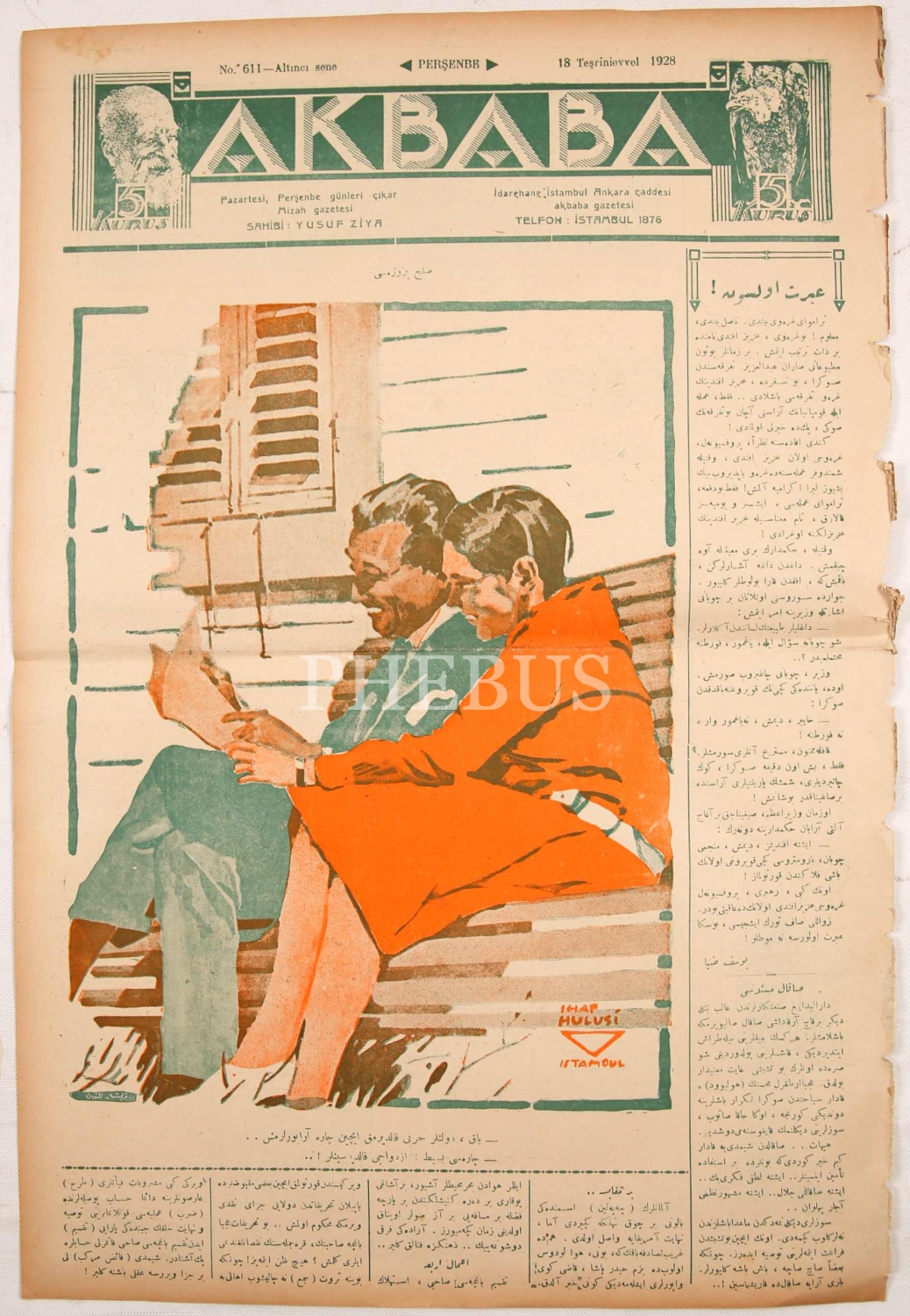 Osmanlıca Akbaba gazetesi, 18 Teşrinievvel 1928, İhap Hulusi imzalı kapak resmi ile, 4 sayfa, 30x45 cm, arka sayfasında kesik mevcut haliyle