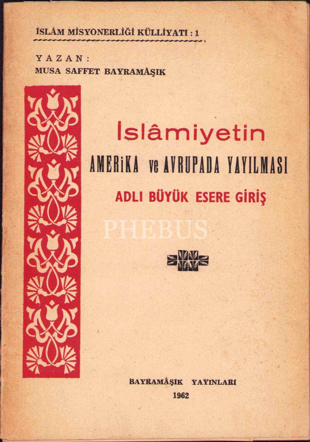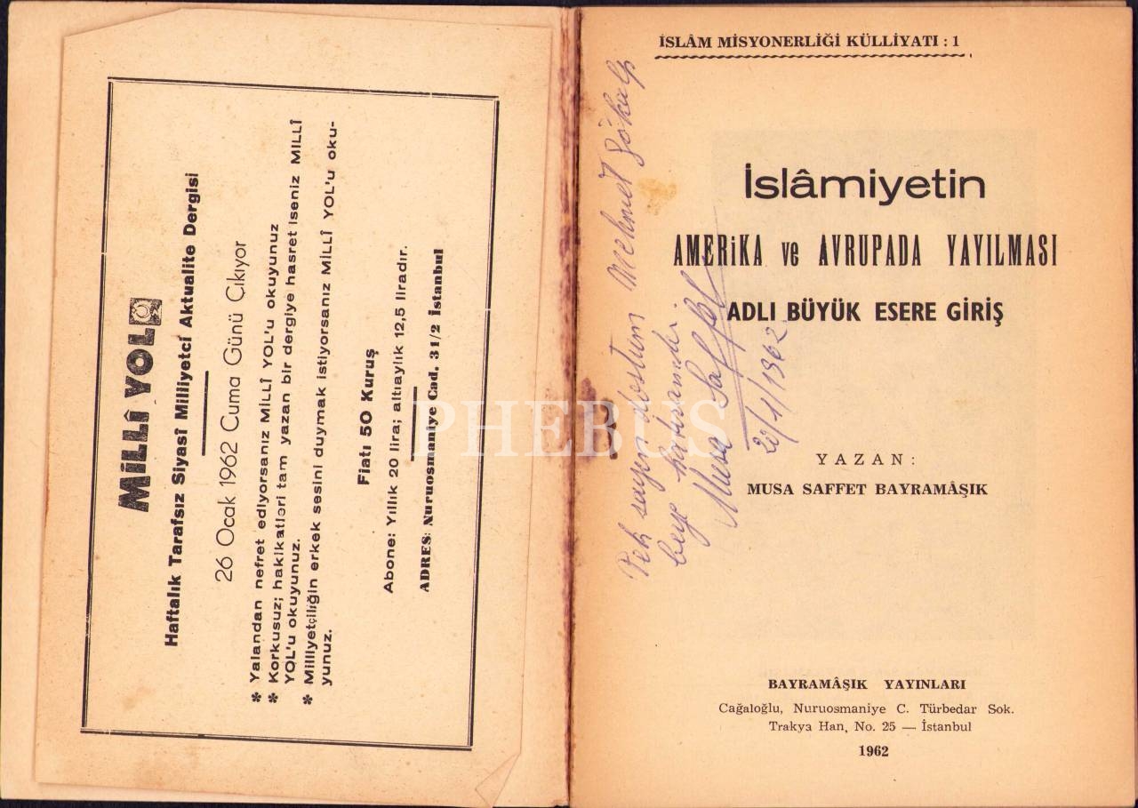 İslâmiyetin Amerika ve Avrupada Yayılması Adlı Büyük Esere Giriş, Musa Saffet Bayramâşık, yazarından ithaflı ve imzalı, Bayramâşık Yayınları, 1962, 48 s., 13x18 cm, sırtı ayrık haliyle