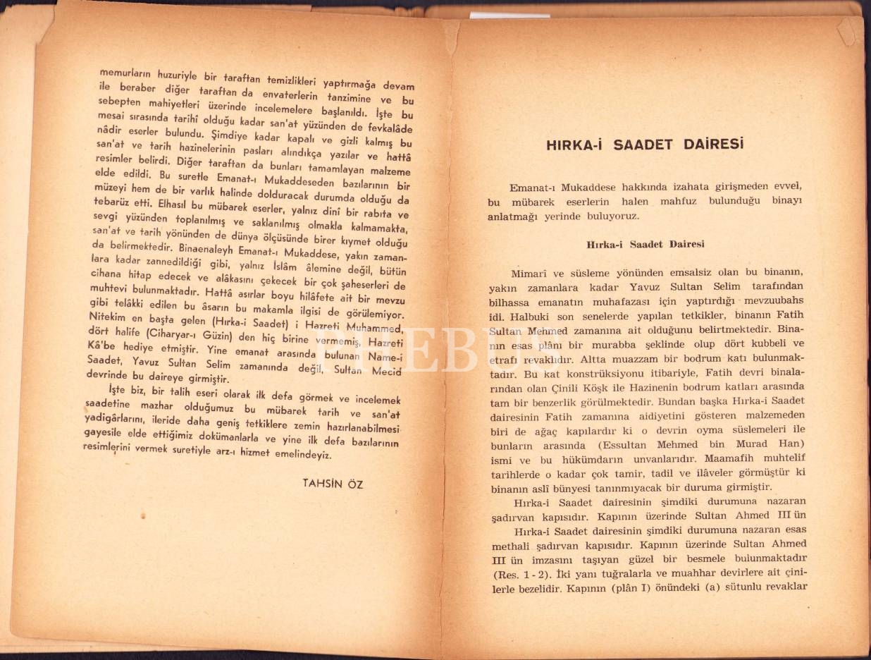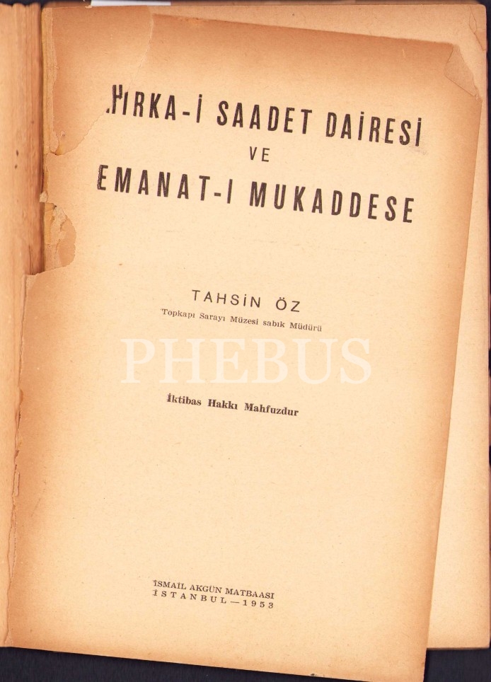 Hırka-i Saadet Dairesi ve Emanat-ı Mukaddese, Tahsin Öz, İsmail Akgün Matbaası, İstanbul 1953, 46 s., 13x20 cm, sırtı ayrık ve yıpranmış haliyle