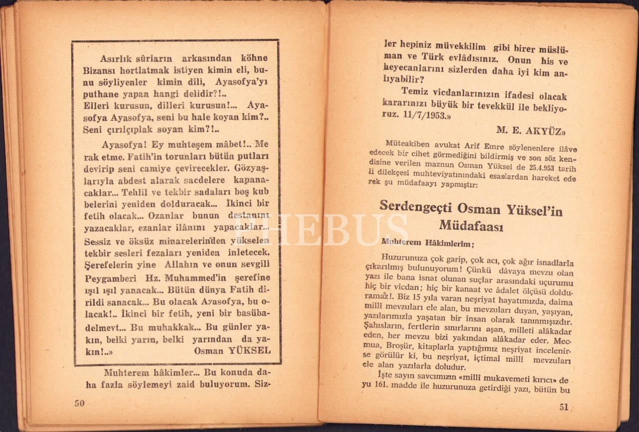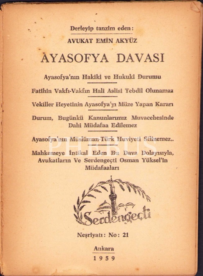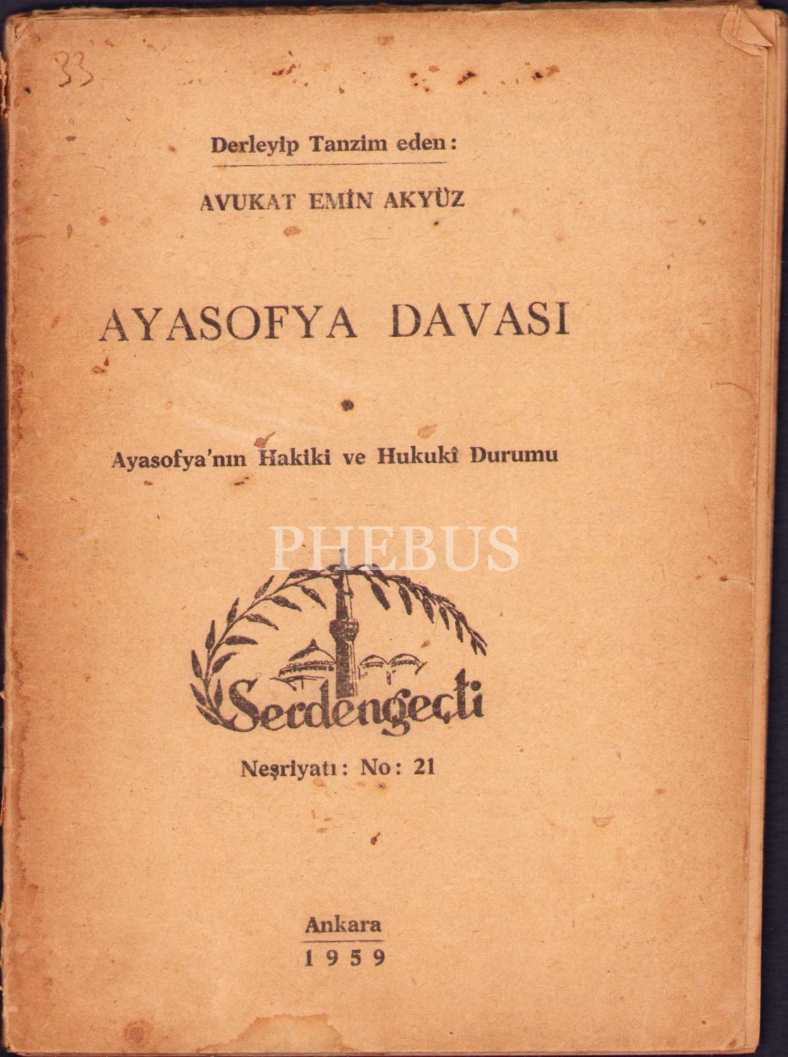 Ayasofya Davası, derl. Avukat Emin Akyüz, Serdengeçti Neşriyatı, Ankara 1959, 67 s., 12x16 cm, kapağı yıpranmış haliyle