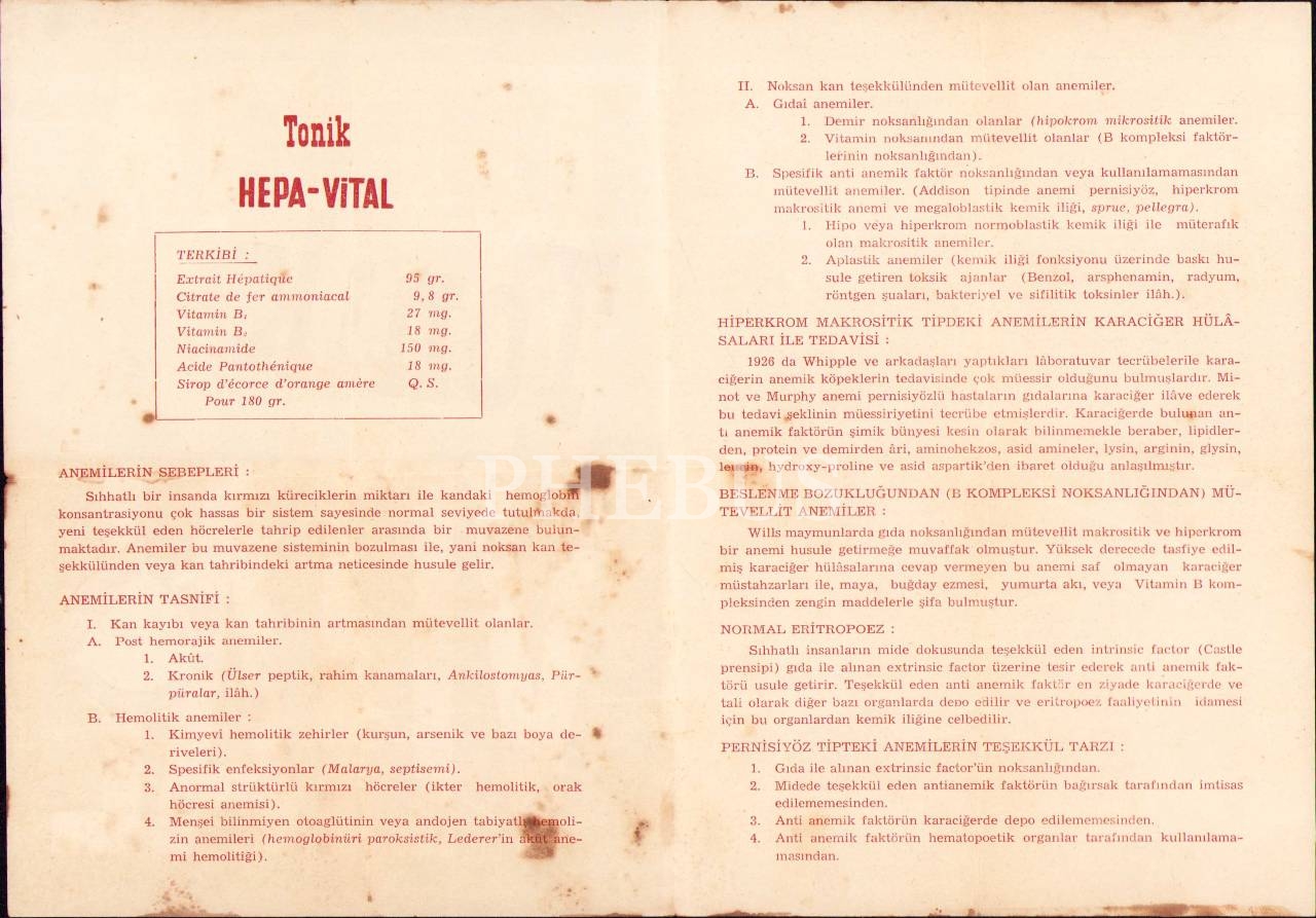 Hepa-Vital ilacı prospektüsü, S. Ferit Eczacıbaşı Müstahzarat Fabrikası, 15x21 cm, yorgun haliyle