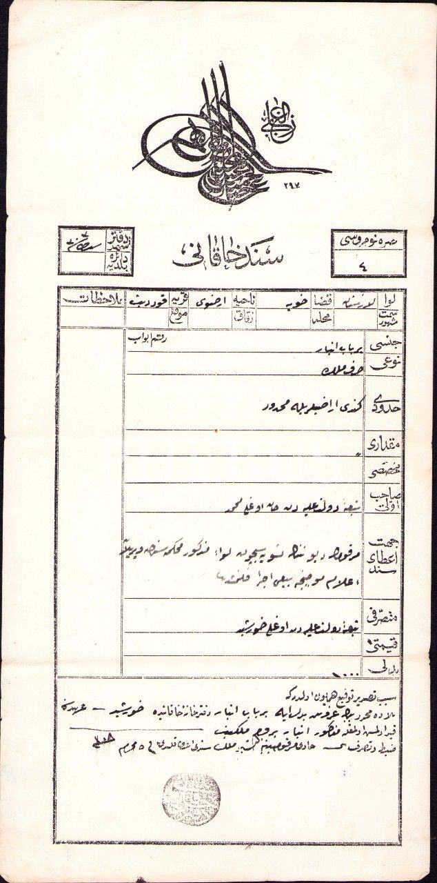 Osmanlıca Sened-i Hakânî antetli mülk ambar tapusu, Lazistan 1308, 18x37 cm