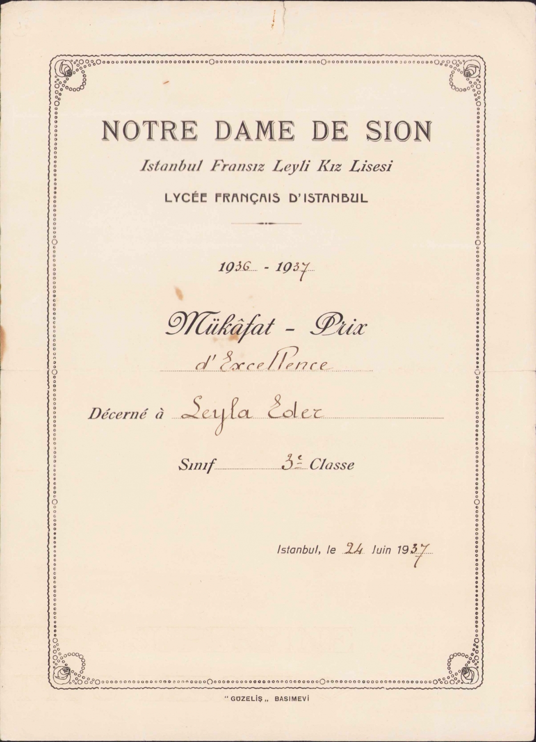 Notre Dame De Sion İstanbul Fransız Leyli Kız Lisesi, mükafat, 1936-1937 dönemi, Güzeliş Basımevi baskısı, 20x28cm