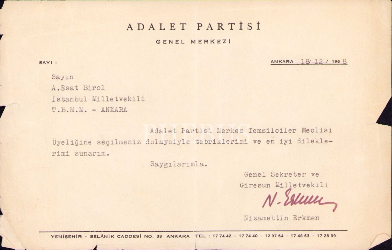 Adalet Partisi Genel Merkezi antetli mektup, Genel Sekreter'den İstanbul Mitlletvekili'ne tebrik mektubu, 1968 tarihli, 14x23 cm, yıpranmış haliyle