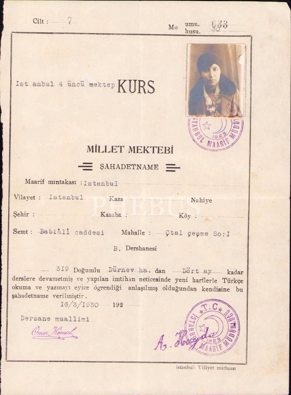 Fotoğraflı Millet Mektebi kurs sertifikası, 1930 tarihli, 18x24 cm