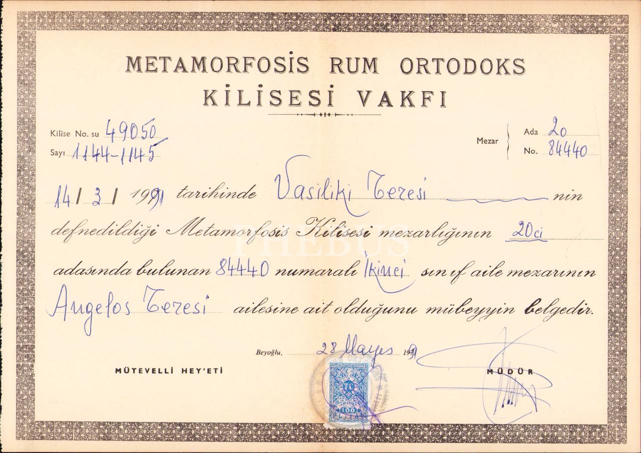 Metamorfosis Rum Ortodoks Kilisesi Vakfı aile mezarı sahiplik belgesi, 1991 tarihli, 22x30 cm