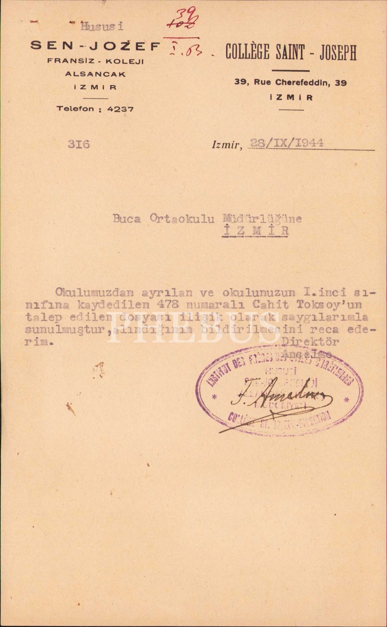 Sen-Jozef Fransız Koleji [College Saint-Joseph]-İzmir antetli bilgilendirme mektubu, 1944 tarihli, 13x21 cm