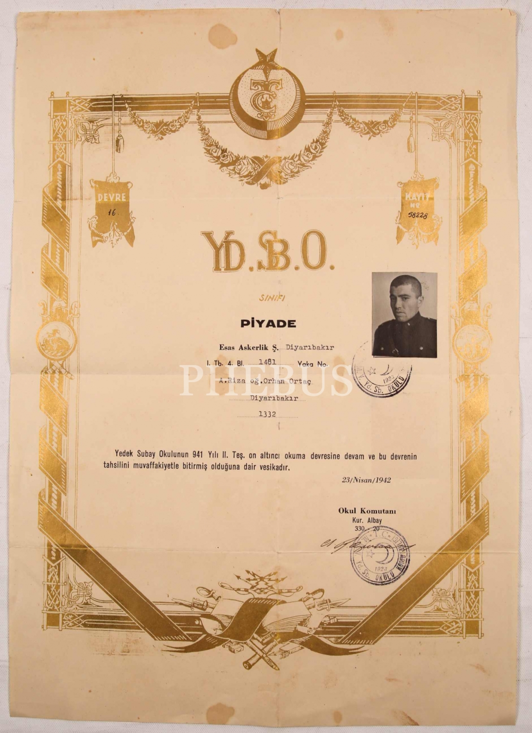 Fotoğraflı Yedek Subay Okulu diploması, 1942 tarihli, 30x42 cm