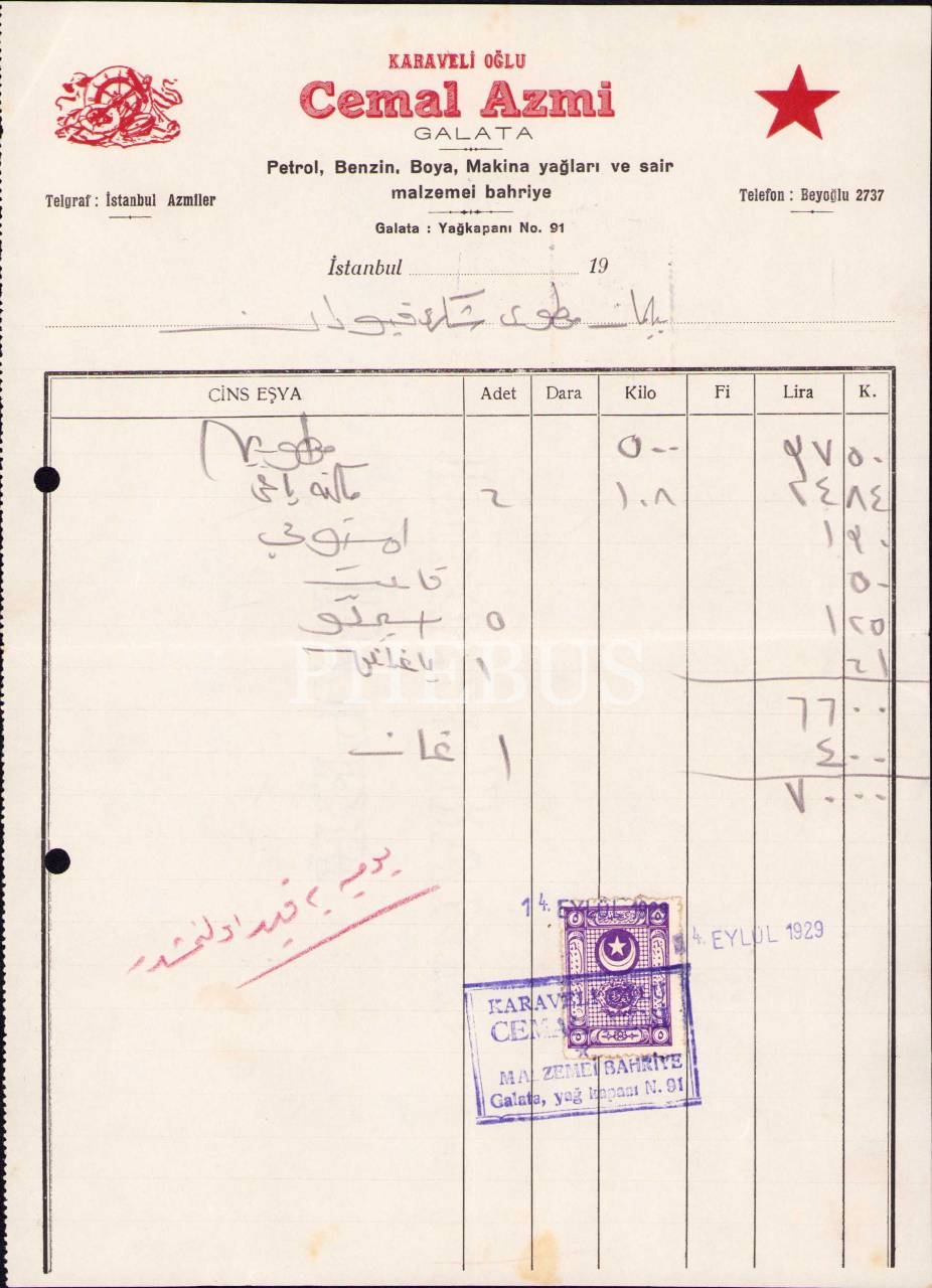 Karaveli Oğlu Cemal Azmi-Galata antetli Osmanlıca fatura, 1929 tarihli, 19x27 cm