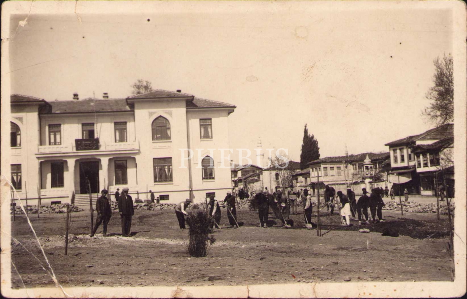 Osmanlıca "Hükümet Dairesi" tabelalı bina önünde peyzaj çalışması yapan halk, epey yıpranmış haliyle