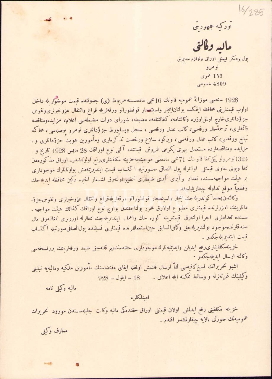 Osmanlıca T.C. Maliye Vekaleti-Pul ve Diğer Kıymetli Evrak ve Levazım Müdürlüğü antetli bilgilendirme mektubu, 1928 tarihli, 18x26 cm